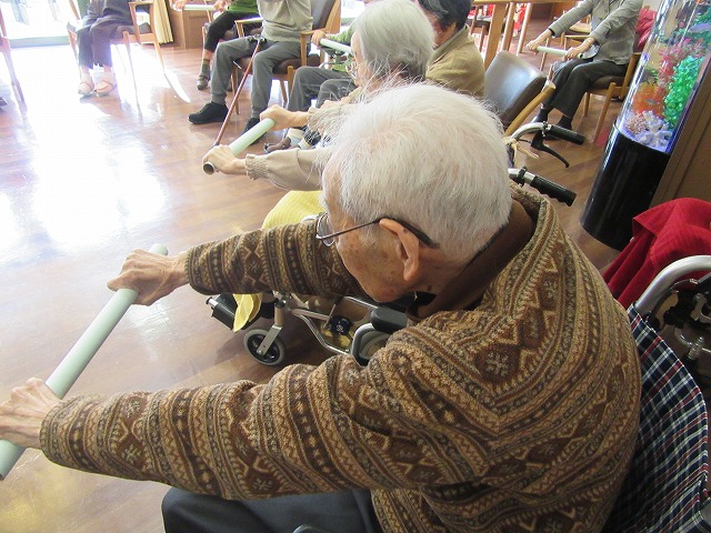 棒をボートのオールに見立て歌いながらのボート漕ぎ運動など。