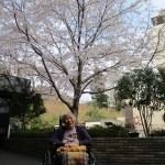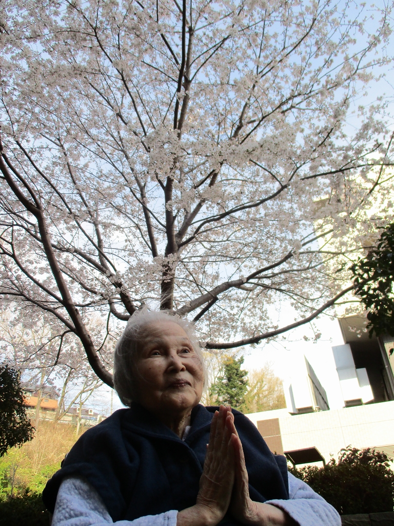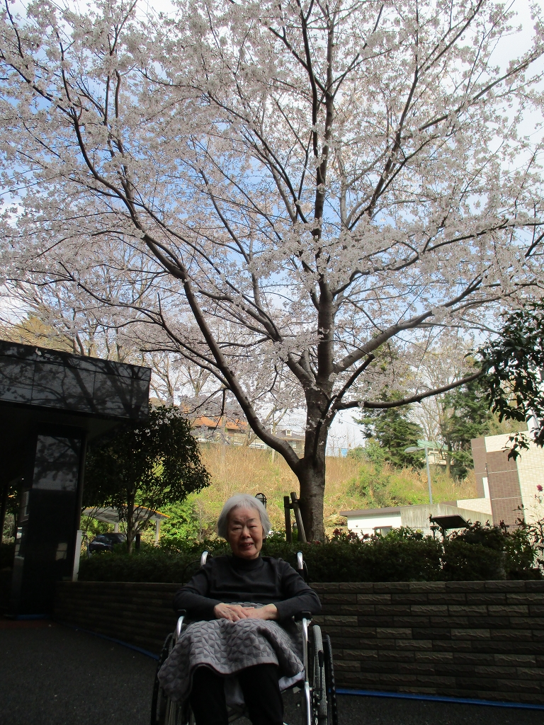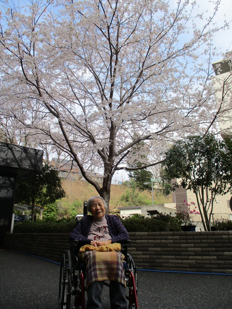 今日は温かく、ご入居者の方とお花見日光浴です。