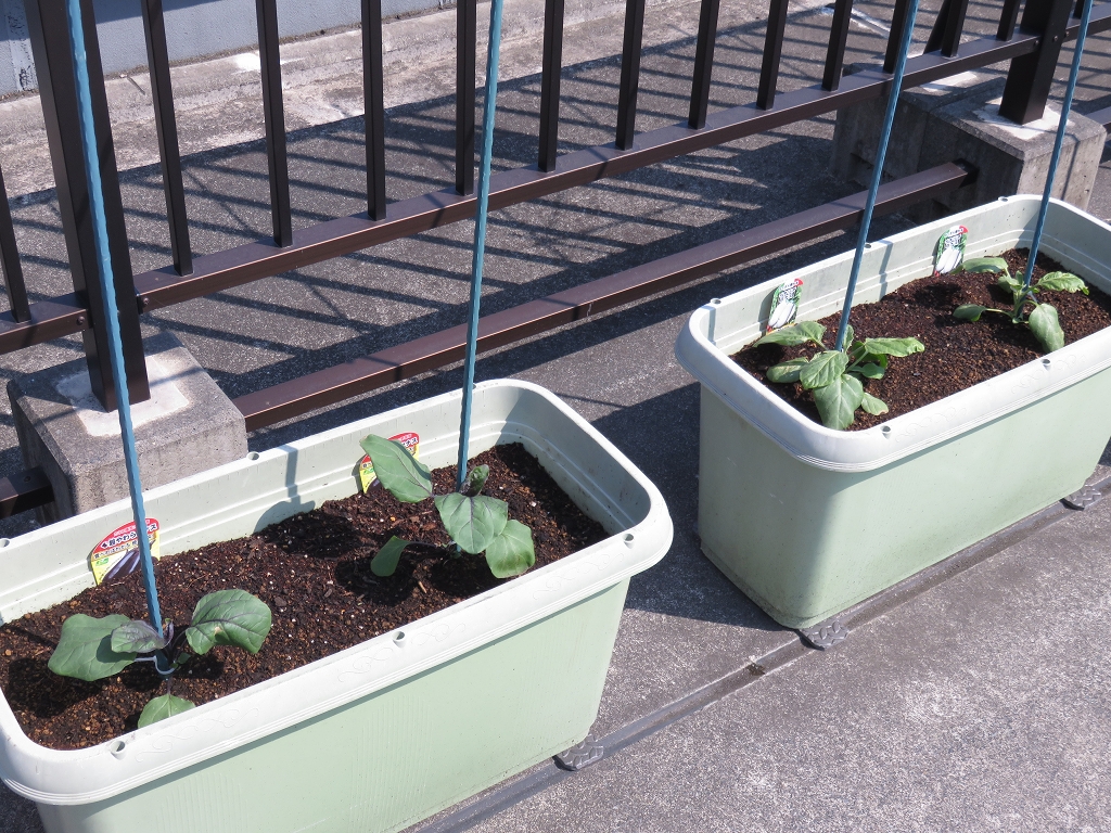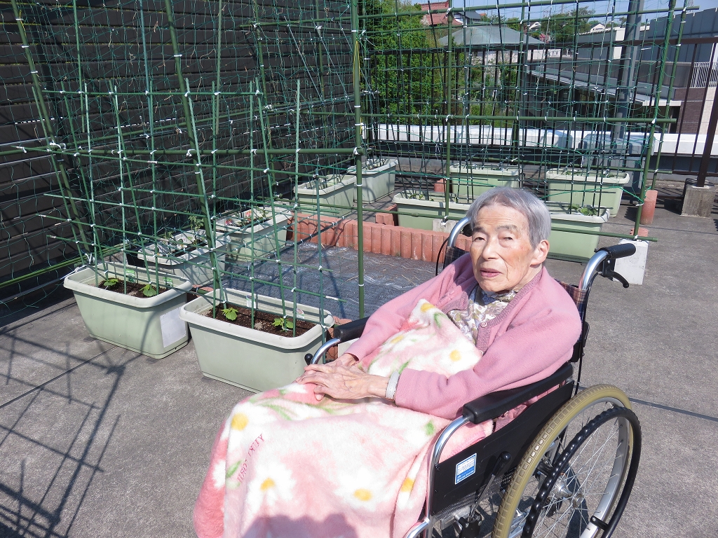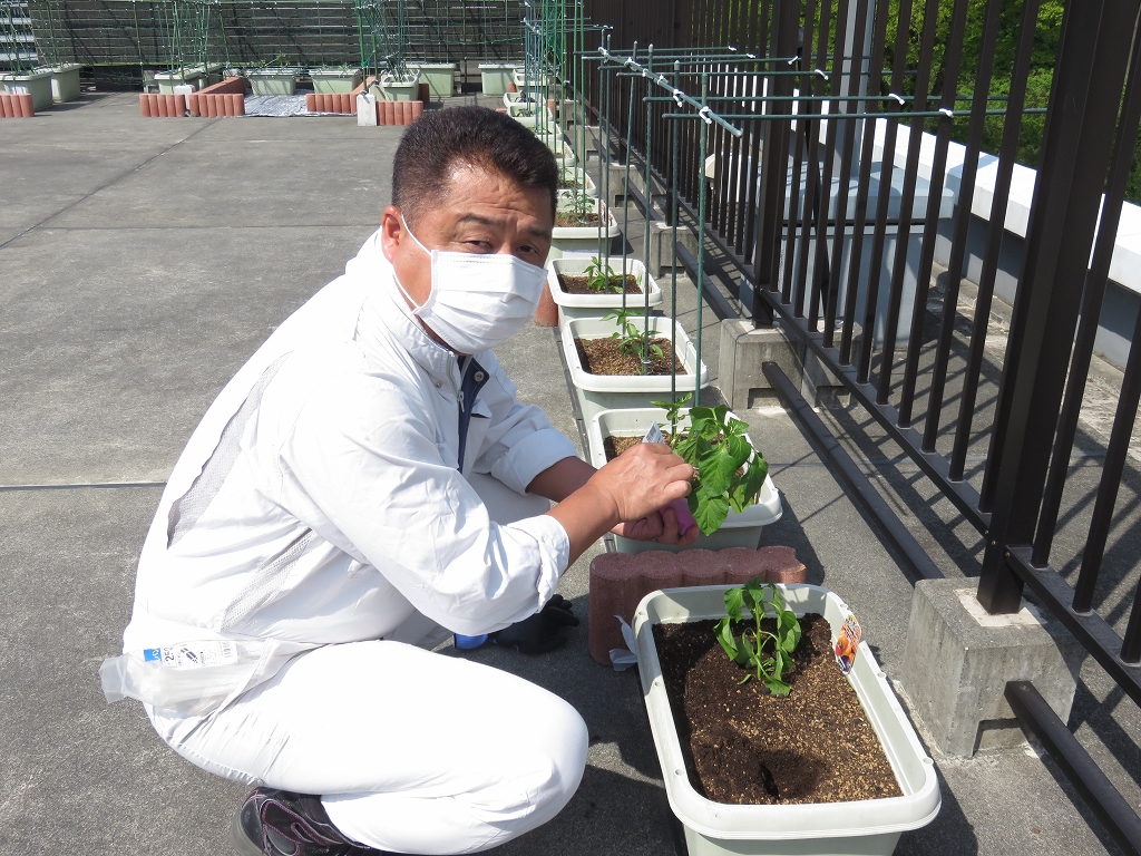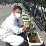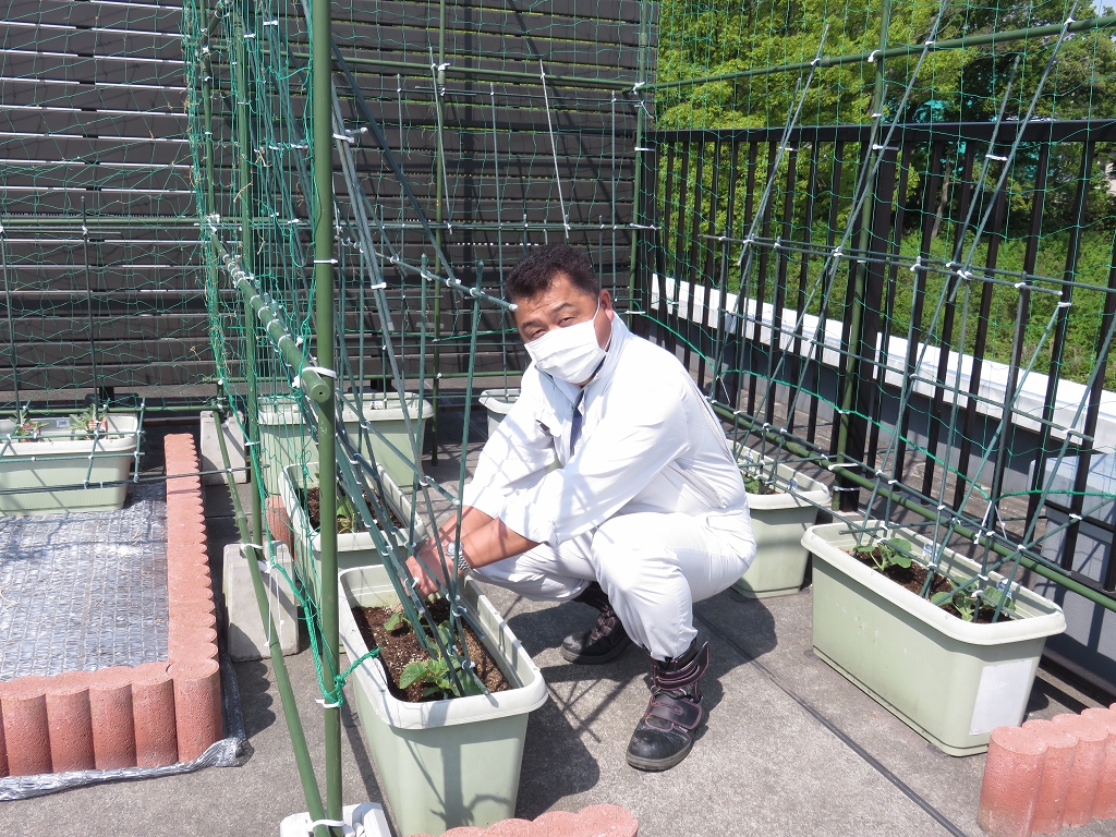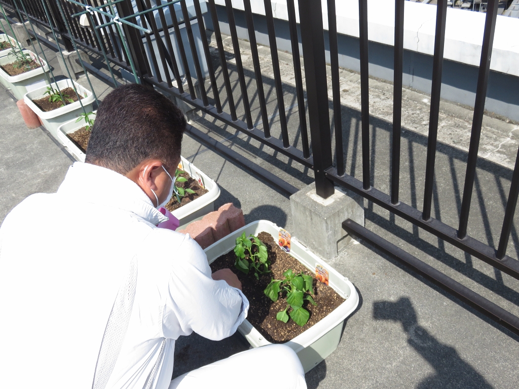 施設のテラスを使用して青木施設長がプランターで農園を作り、たくさんの野菜の苗を植えました。