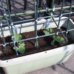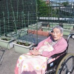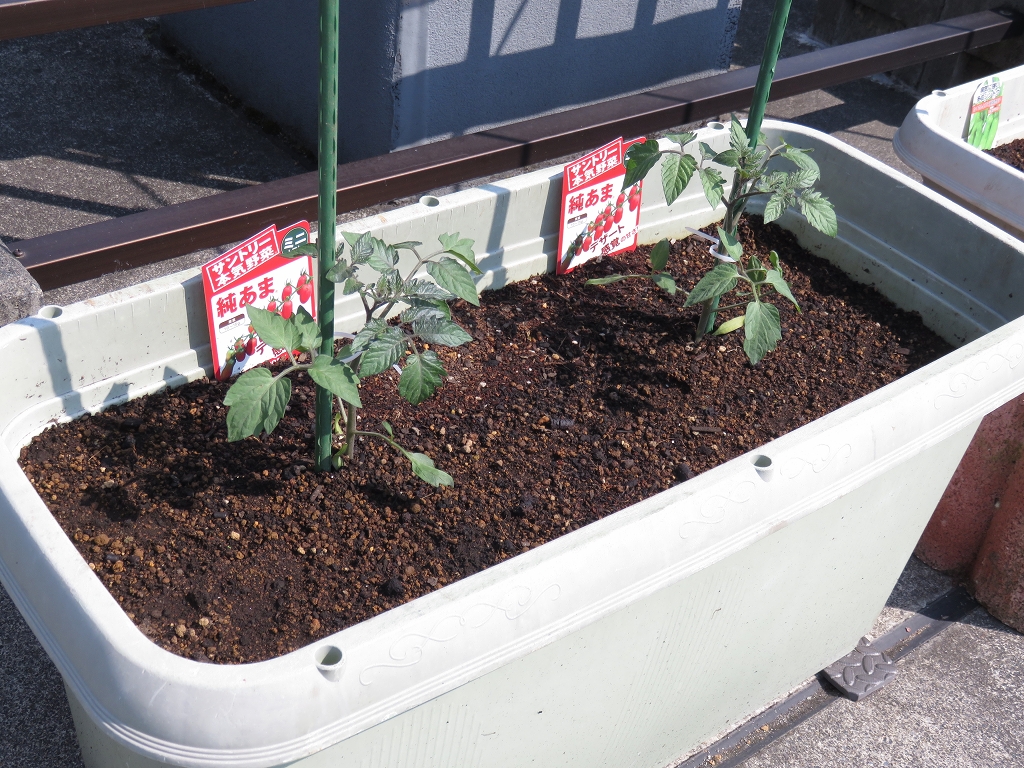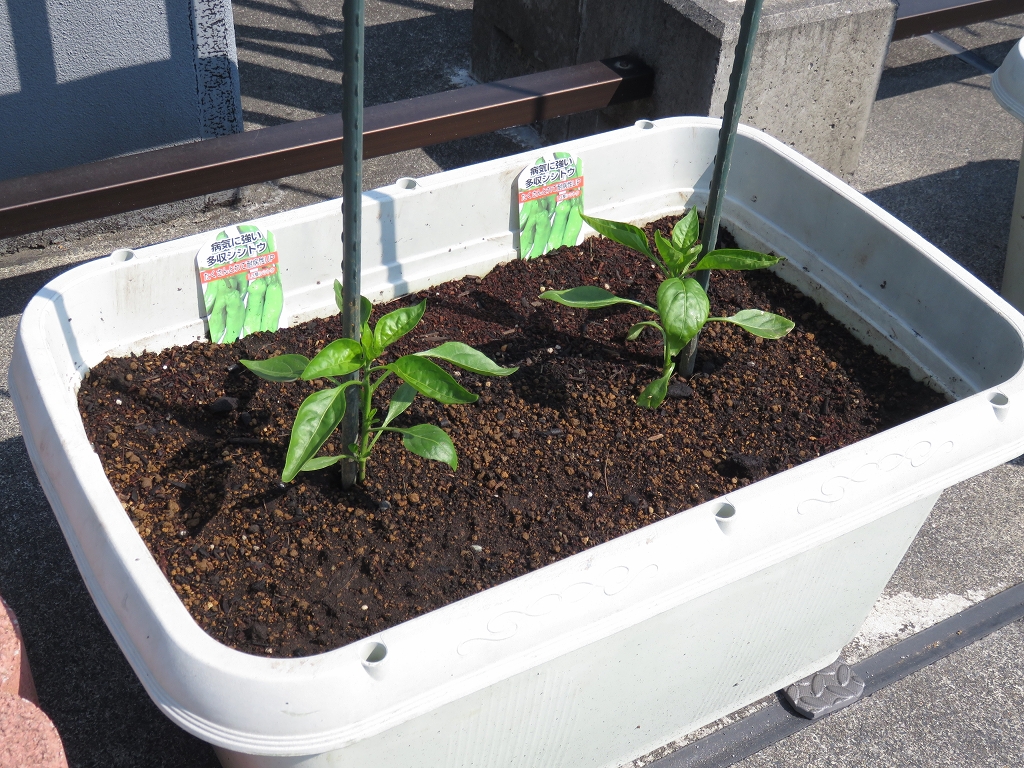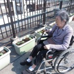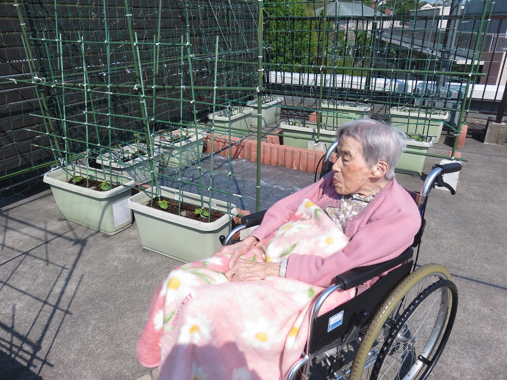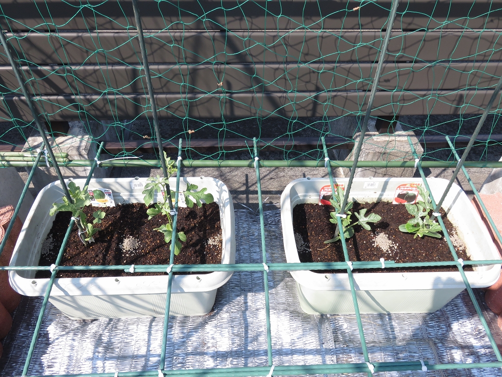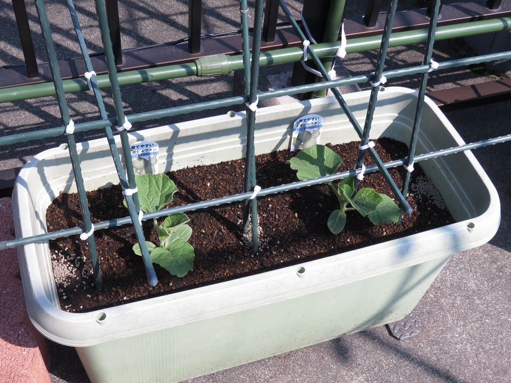 施設のテラスを使用して青木施設長がプランターで農園を作り、たくさんの野菜の苗を植えました。