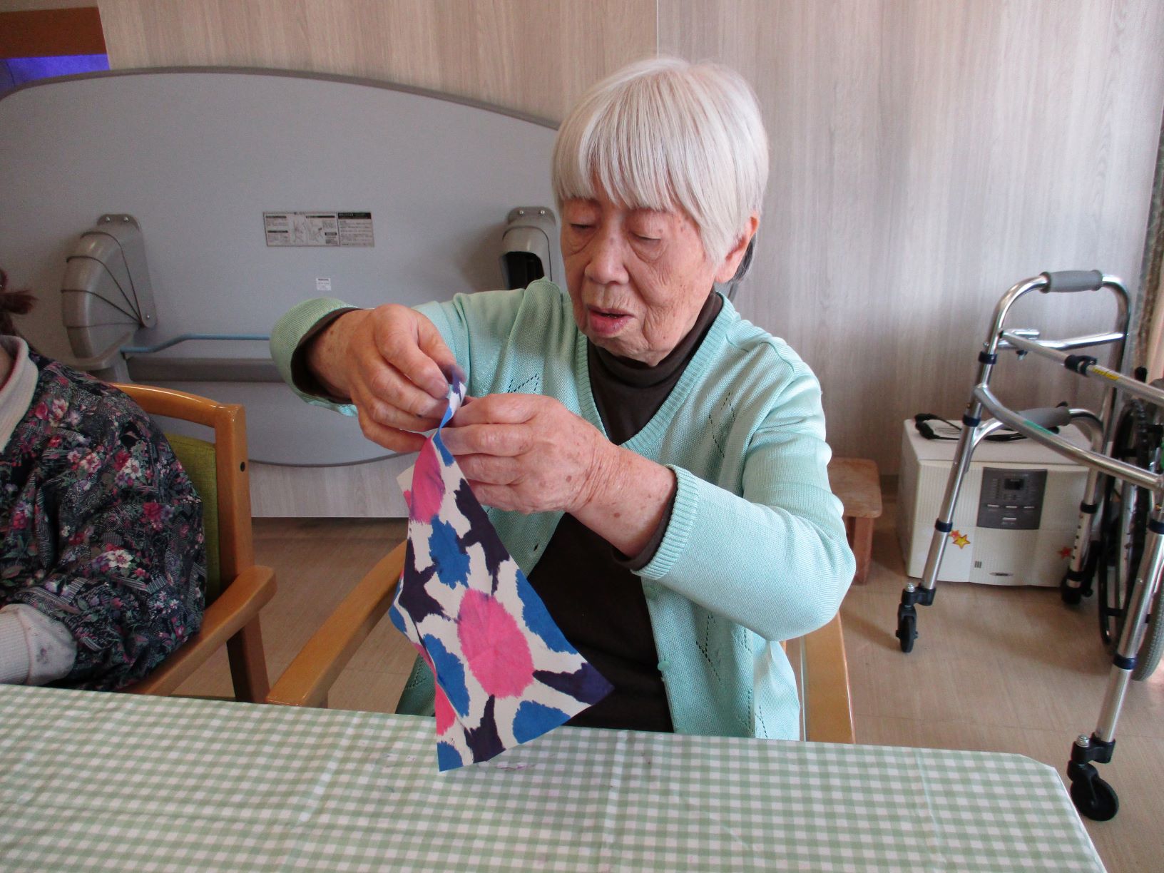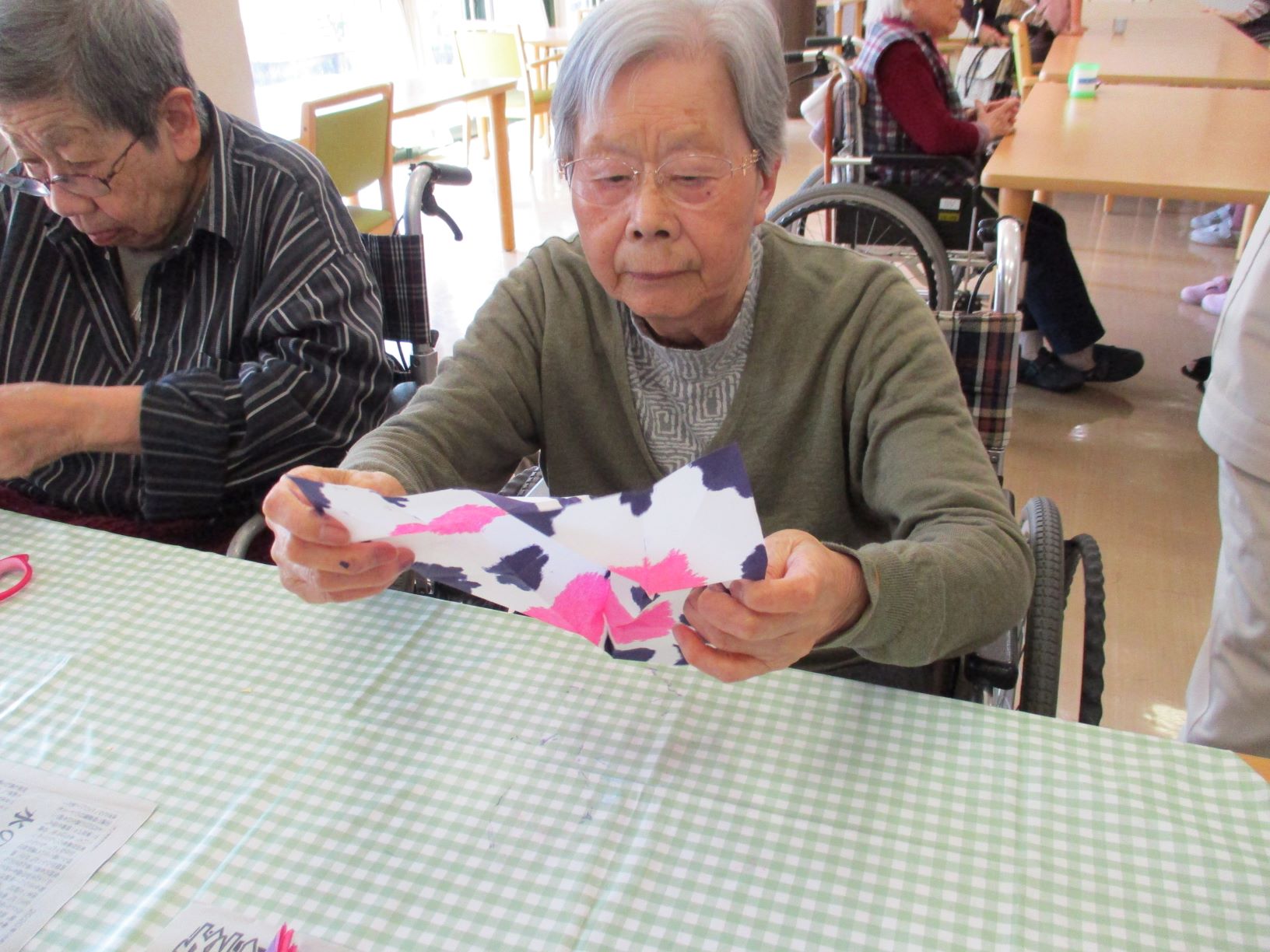 紫陽花は、障子紙をジャバラ折で小さく三角形に折り、