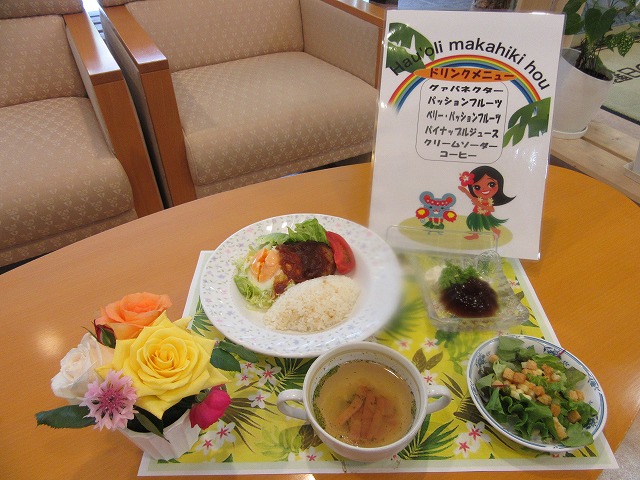 昼食のメニューも、ロコモコ丼、オニオンスープ、グリーンサラダなど