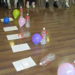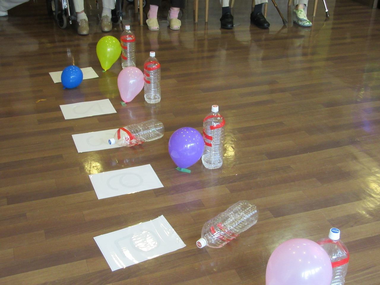 2チームに別れ、ボールを転がしてペットボトルを倒し、風船を割ります。
