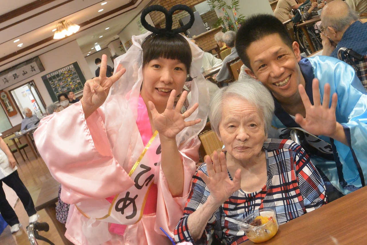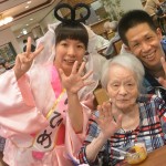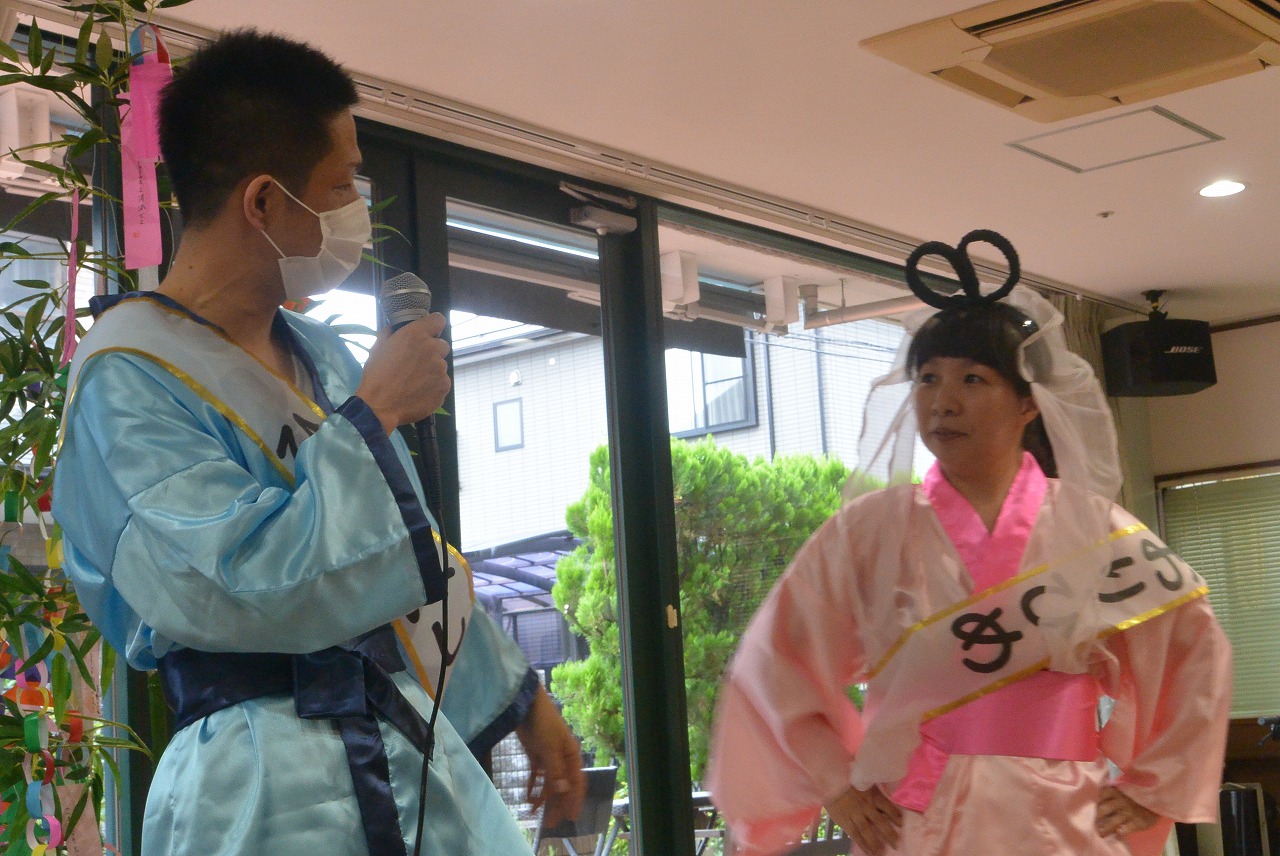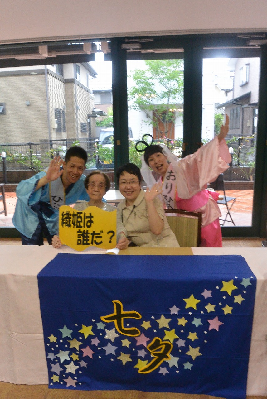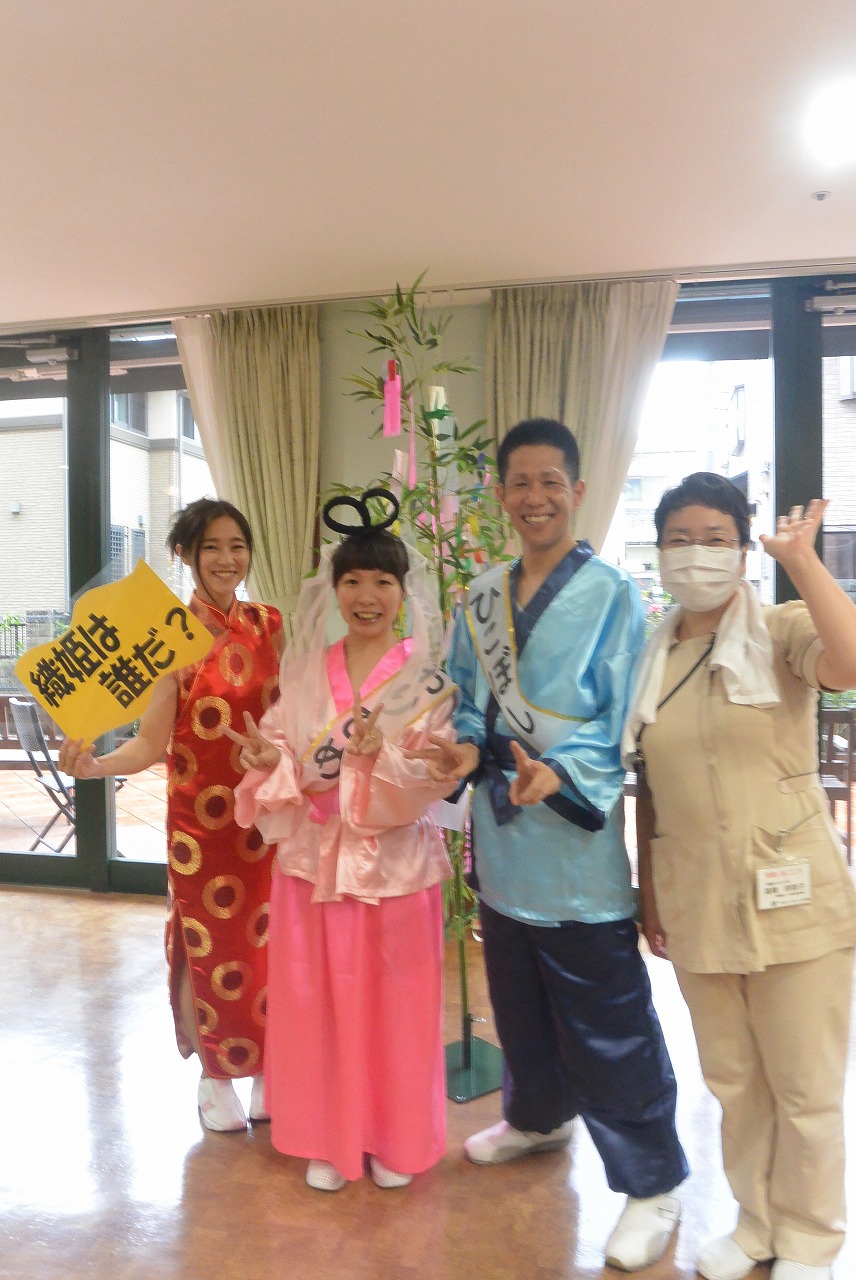 見事織姫に選ばれた女の子。衣装に着替え、パンパンのお腹を抱えながらご入居者の皆様と記念撮影!
