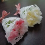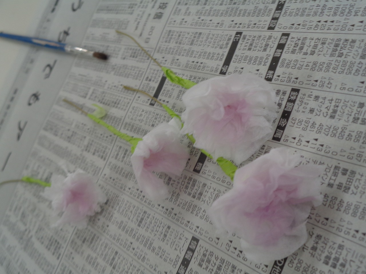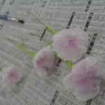 緑色の針金を巻き付け、ティッシュを開きお花にします。