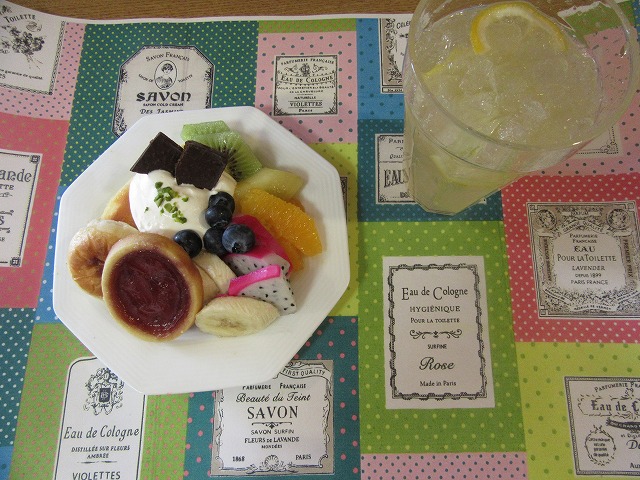 ミントチョコ、生クリームと果物を盛り合わせて。
