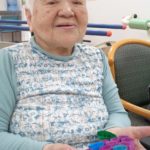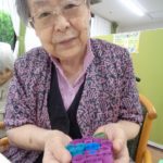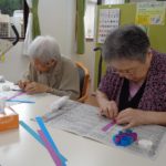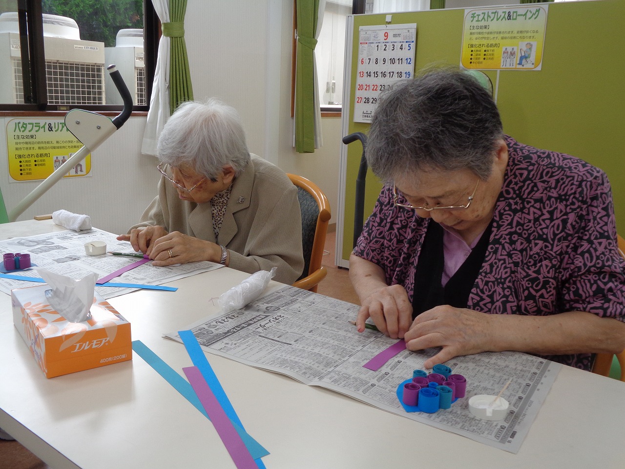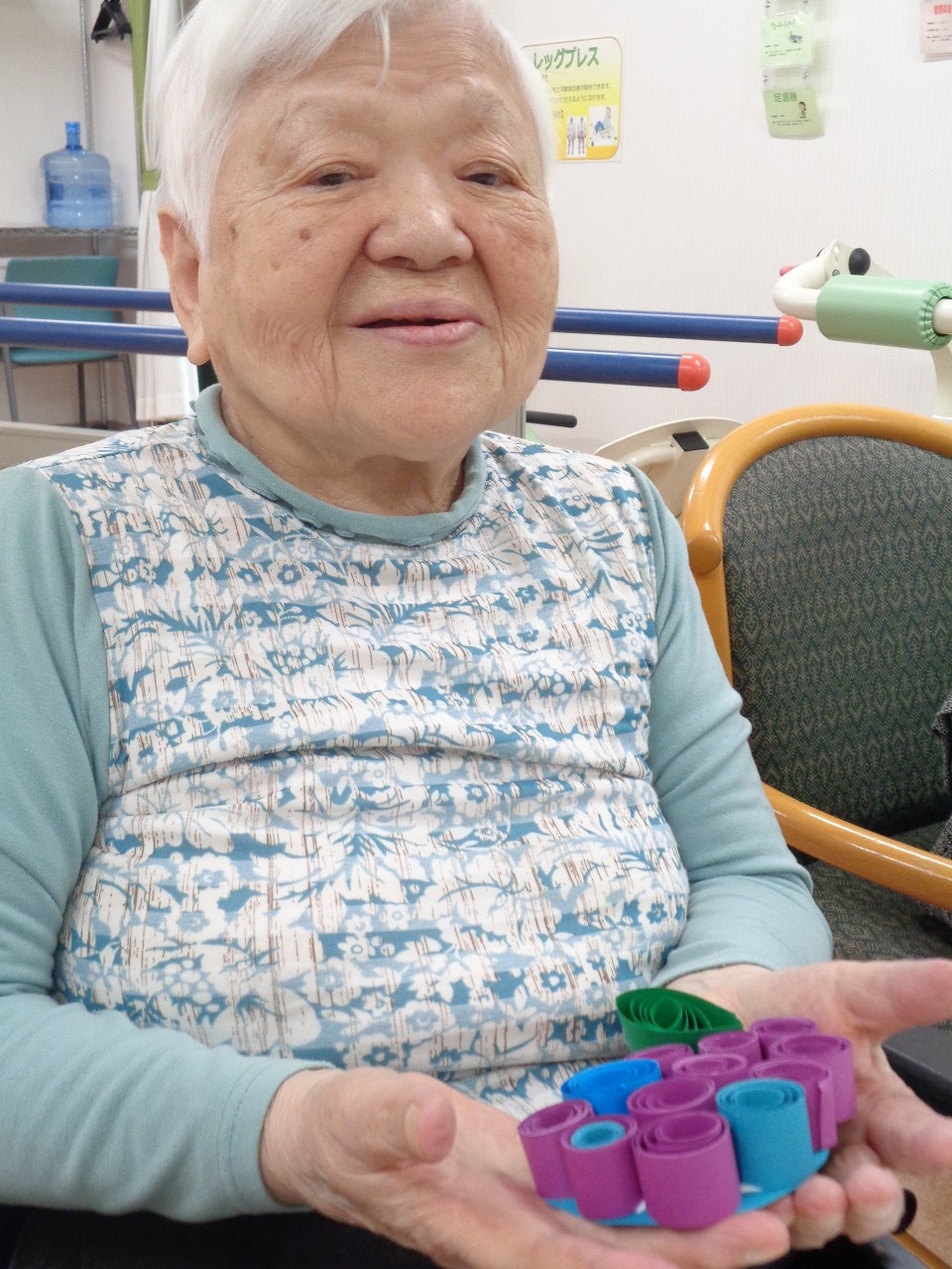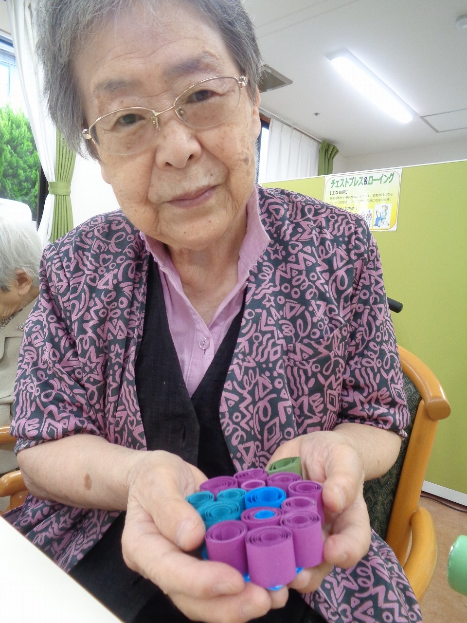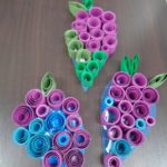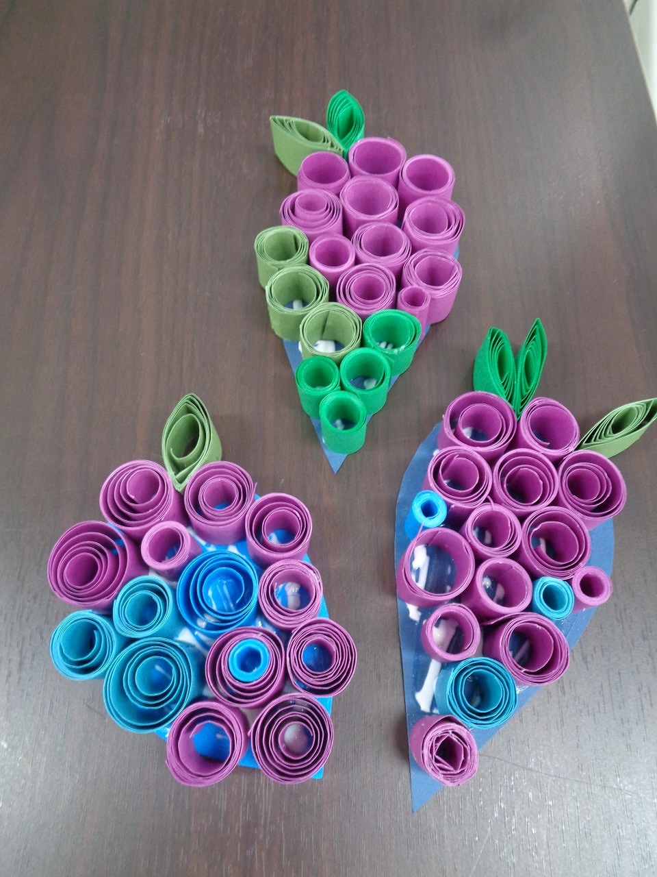 2センチ幅に切った縦長の色紙を、えんぴつにくるくる巻き付け、ブドウの房を沢山作っていただきます。