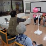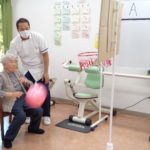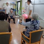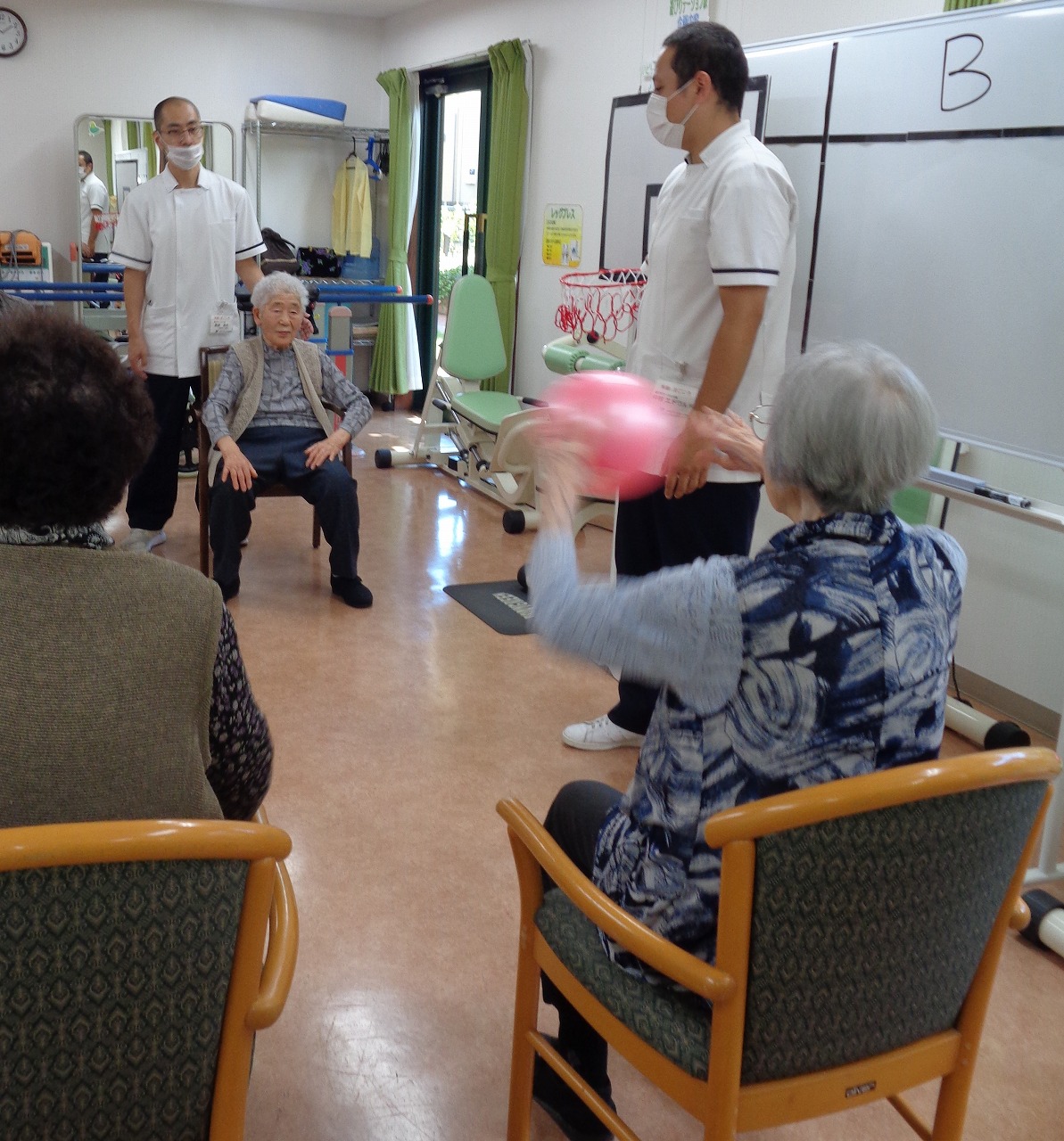 リハビリ室にてバスケットボールをテーマに運動を行いました。