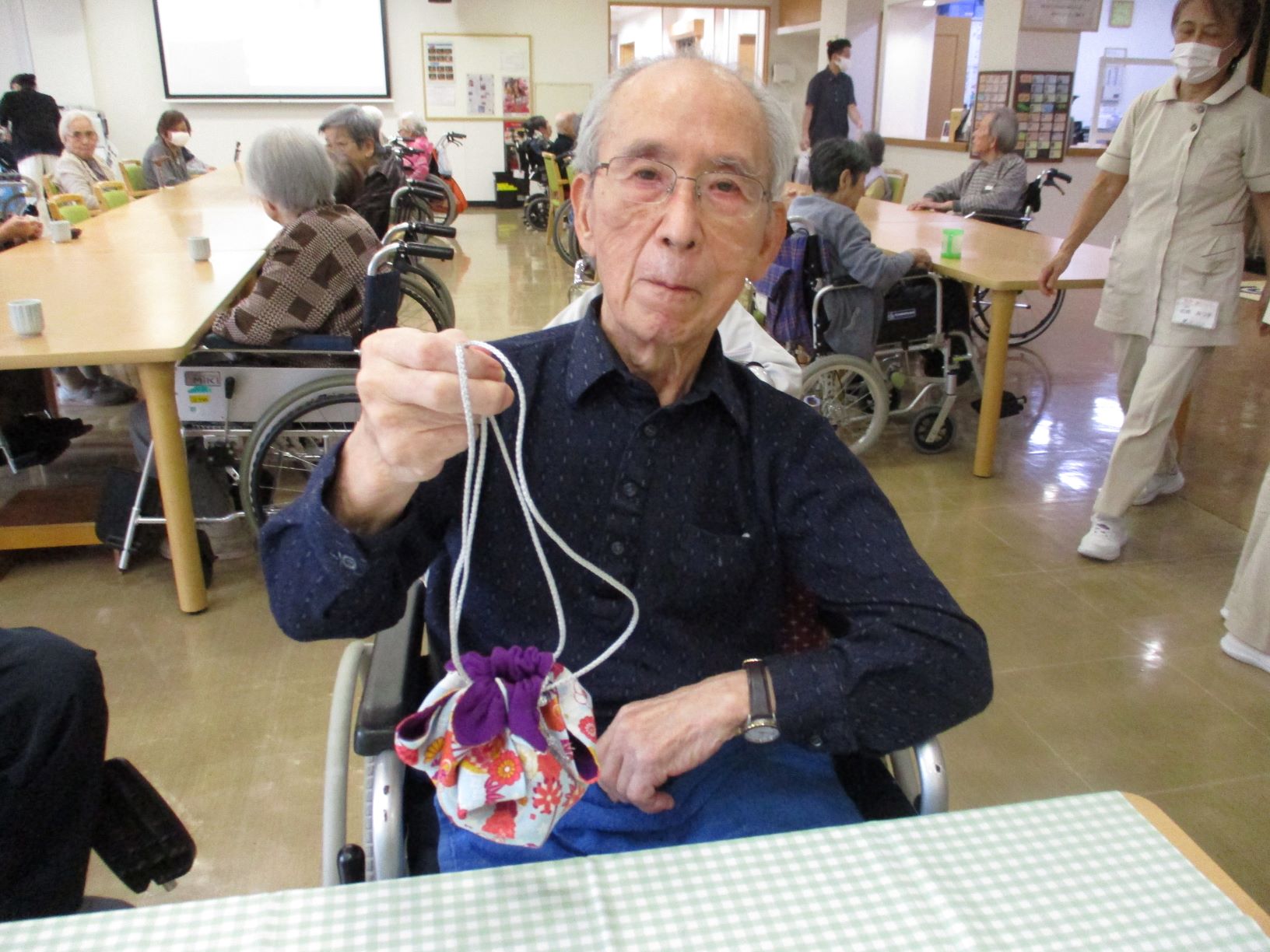 四角い布の四隅を折り返し縫い、紐を通すという作業をして頂きました。