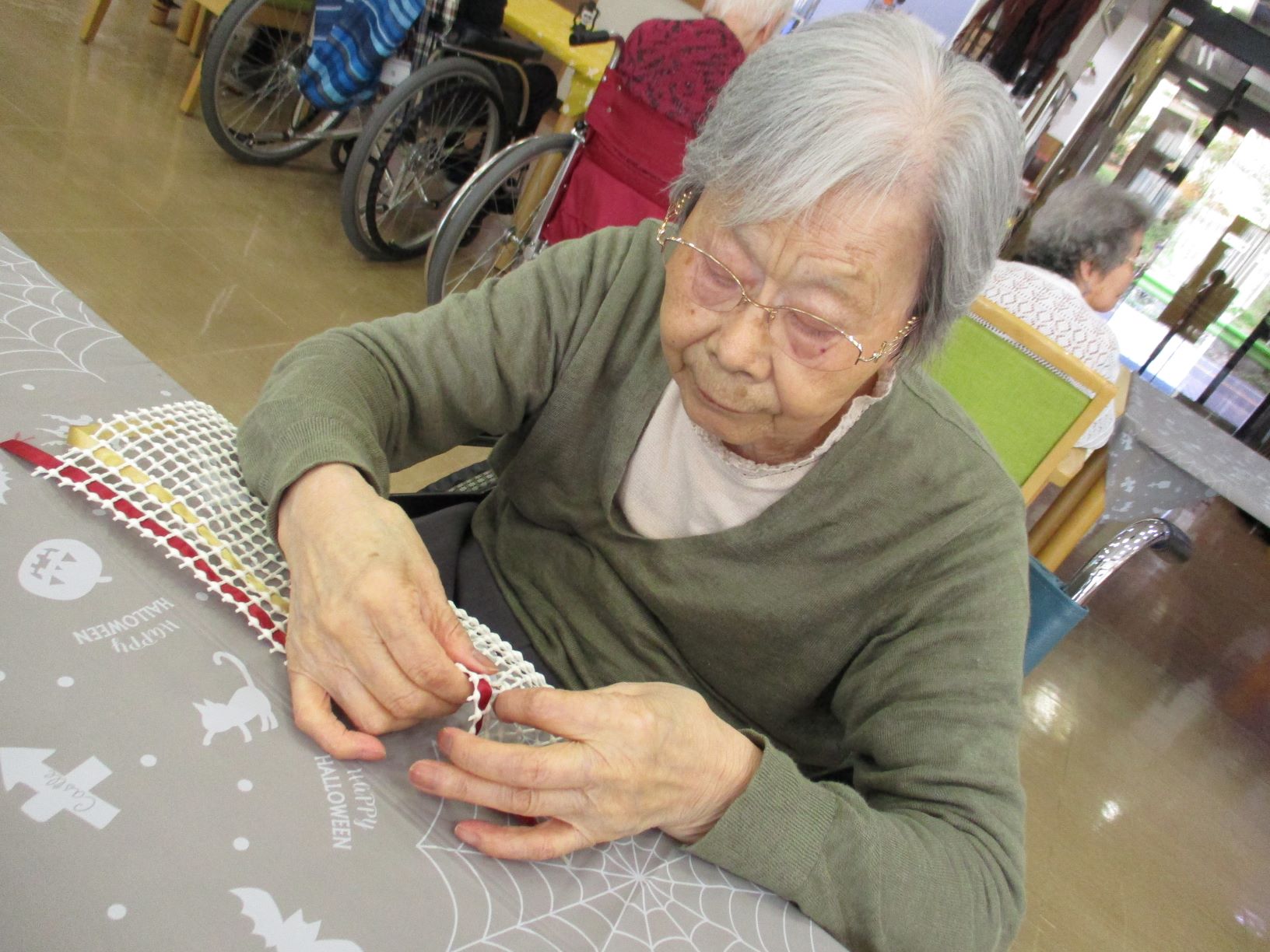 滑り止めシートのマス目にカラフルなリボンを通して作るのですが、