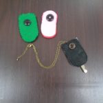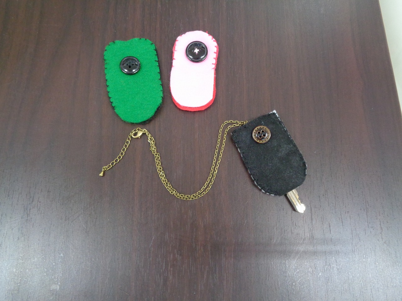 フェルトに飾りボタンをひとつ付けていただき、鍵が出るくらい間を取って両端を縫っていきます。