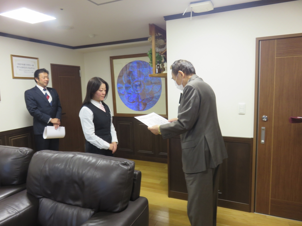 令和2年12月17日に特別功労賞の表彰がありました。特別功労賞とは、その年に優秀な功績を残した職員を称え、その者に送られる賞です。今年、選ばれたのは勤続25年の営業部部長の藤井と事務部部長の蛯原です。藤井はこれまでシルバービレッジとご家族の懸け橋となり、多くのご入居者にゆったりと安心の毎日を過ごしていただきました。蛯原はそのご入居者の相談業務を行い、そのご家族とも連絡を取り合い生活の質を高めてまいりました。これからも30年、35年とシルバービレッジの職員の鑑として、頑張っていただきたいと思います。