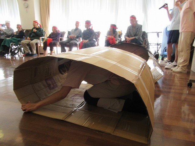 段ボールでのキャタピラ競争(リレー形式)が行われました。