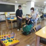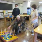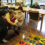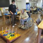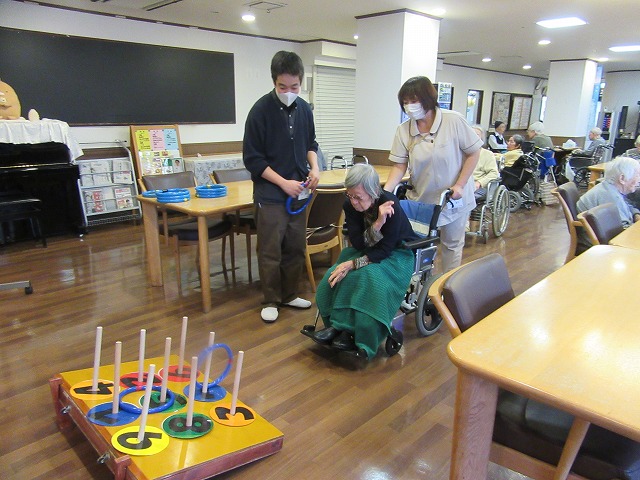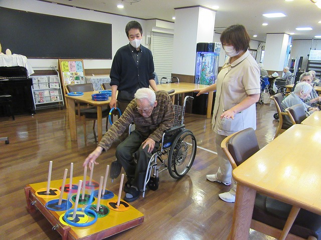 今回は「輪投げ」を行いました。輪投げは毎回運動レクでは好評でして、