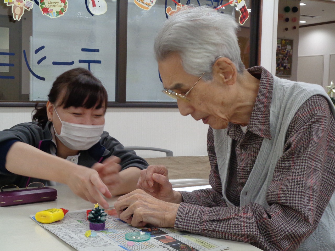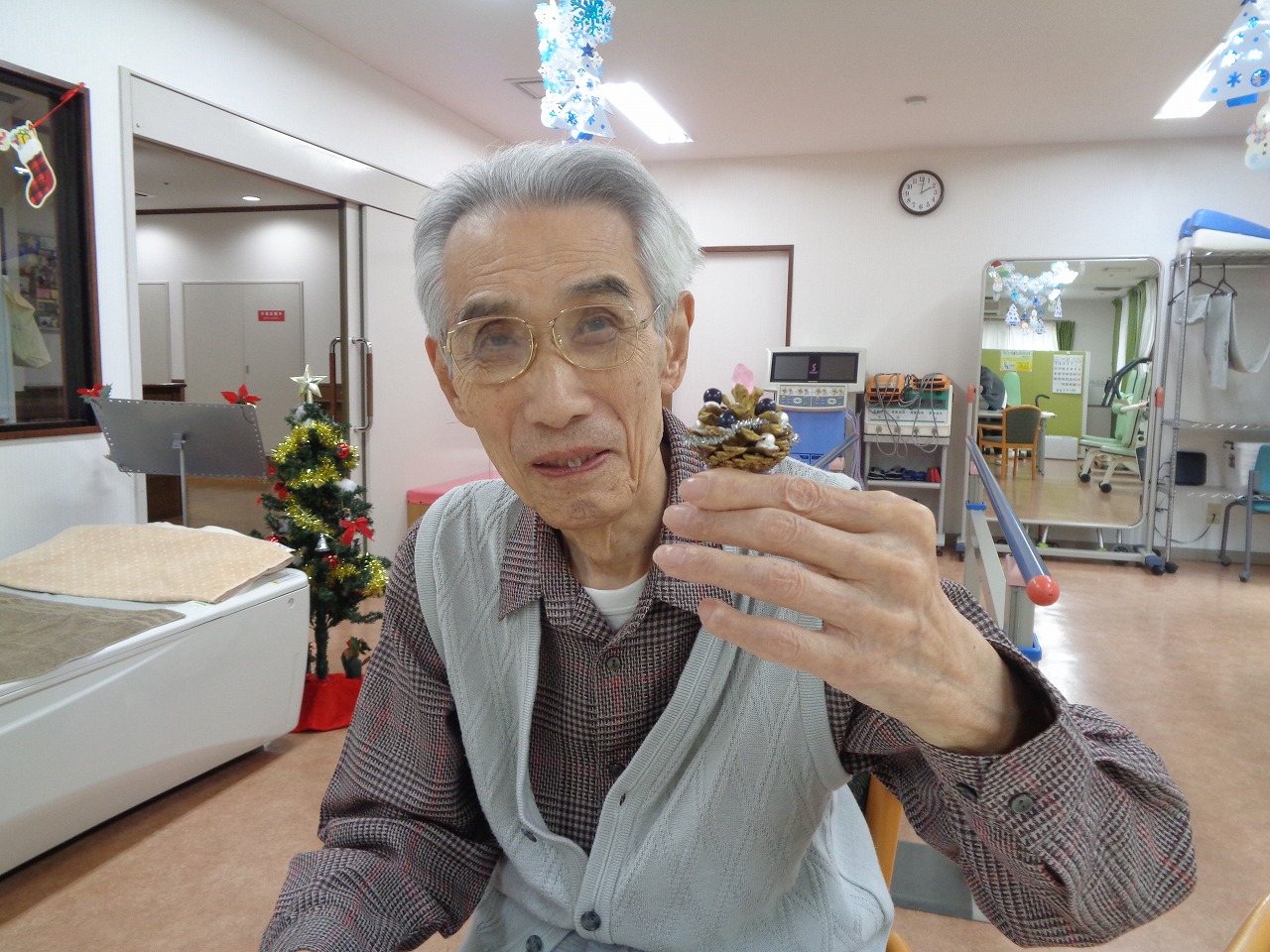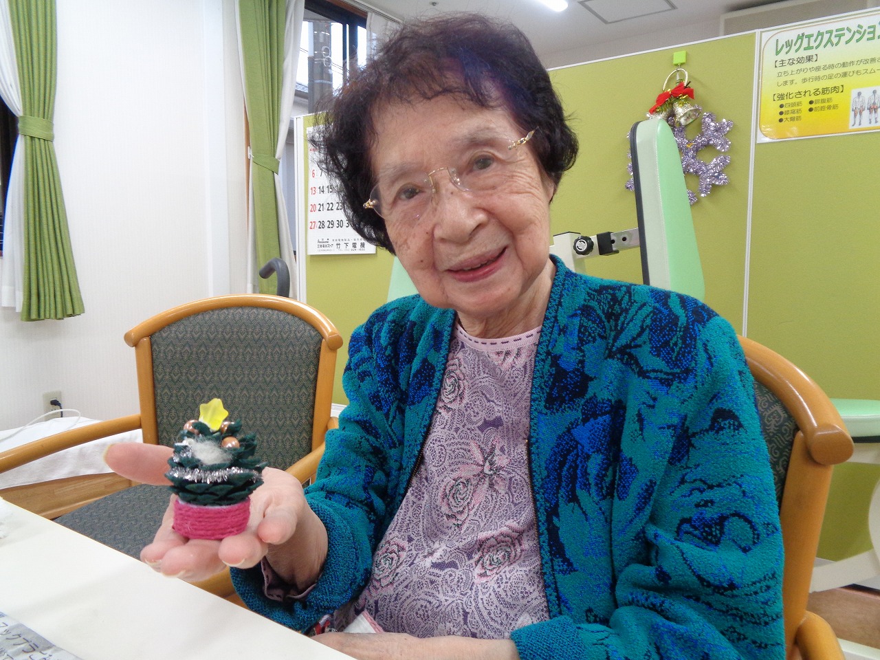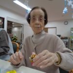 12月2日(水)、本日の手作りクラブは前回色を塗っていただいた松ぼっくりに飾りを付けていただきました♪ビーズやモール、綿などお好きな物をボンドで付けていきます。