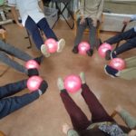 両足でボールを挟んで上に持ちあげたり、歌に合わせてボールを踏んだりと様々な運動に挑戦していただきました!