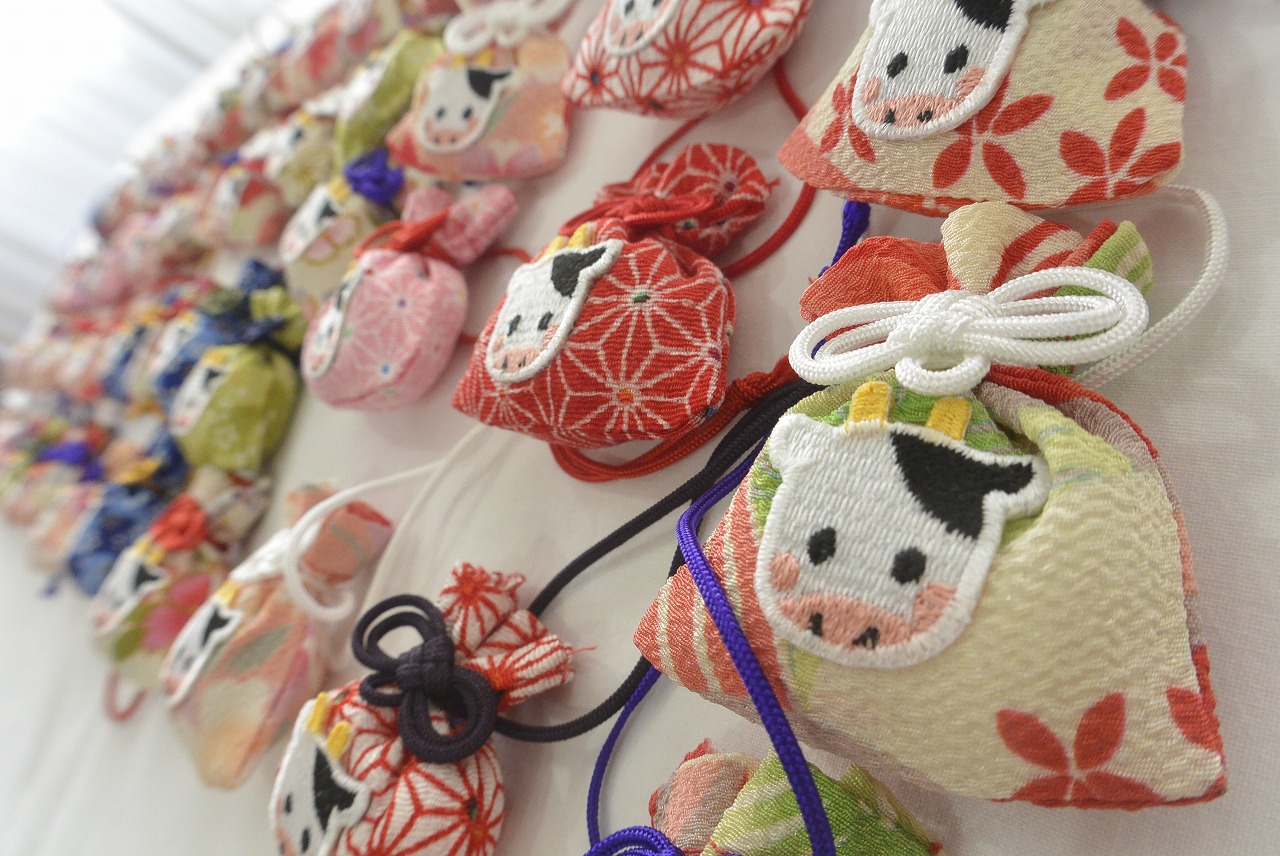 手作りのお守りには、干支の丑がかわいらしくあしらわれ、今年の健康を祈る気持ちがたくさん込められています。