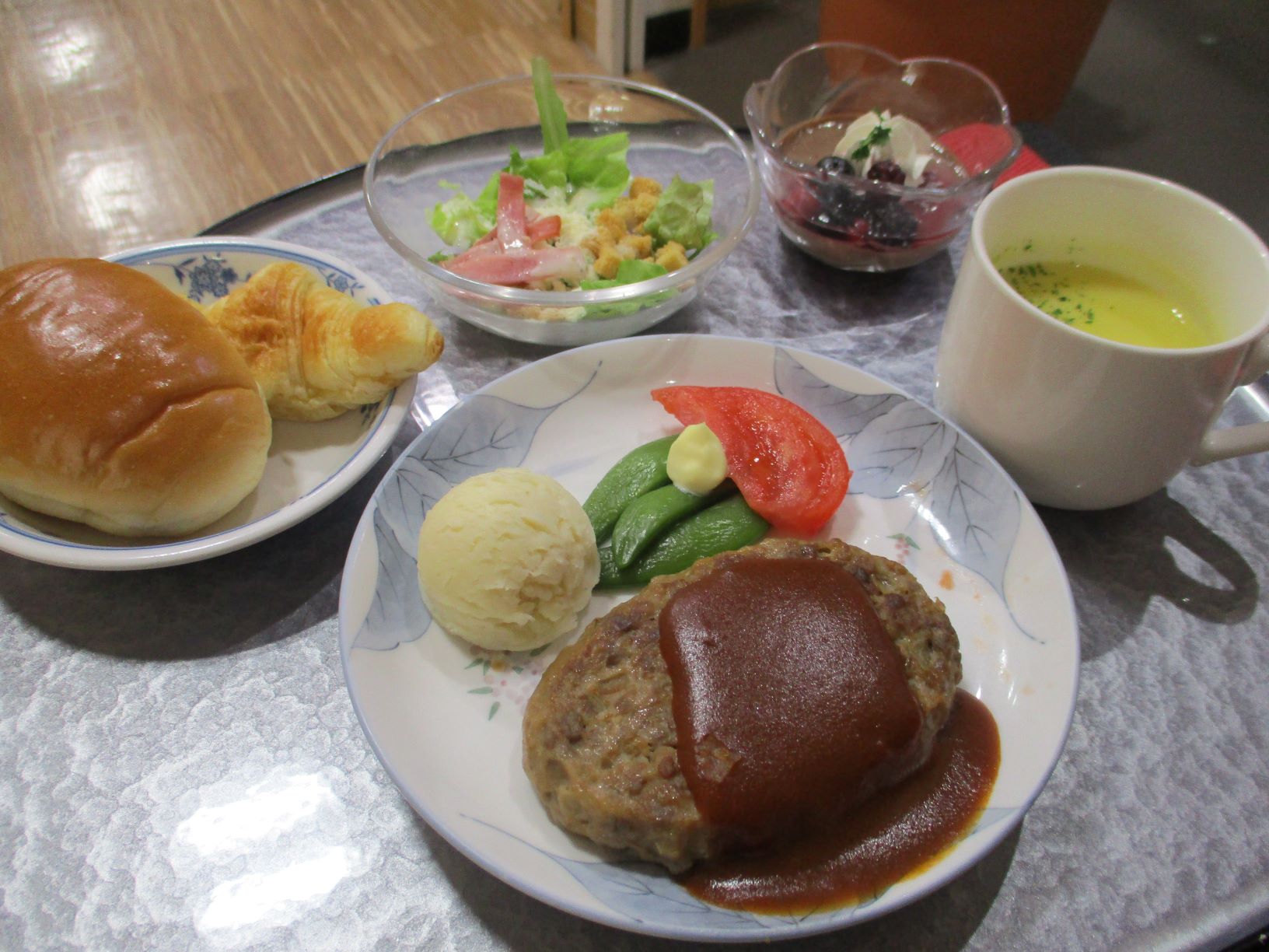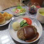 「ハンバーグ」「彩りサラダ」「パン」「手作りチョコプリン」となっております。
