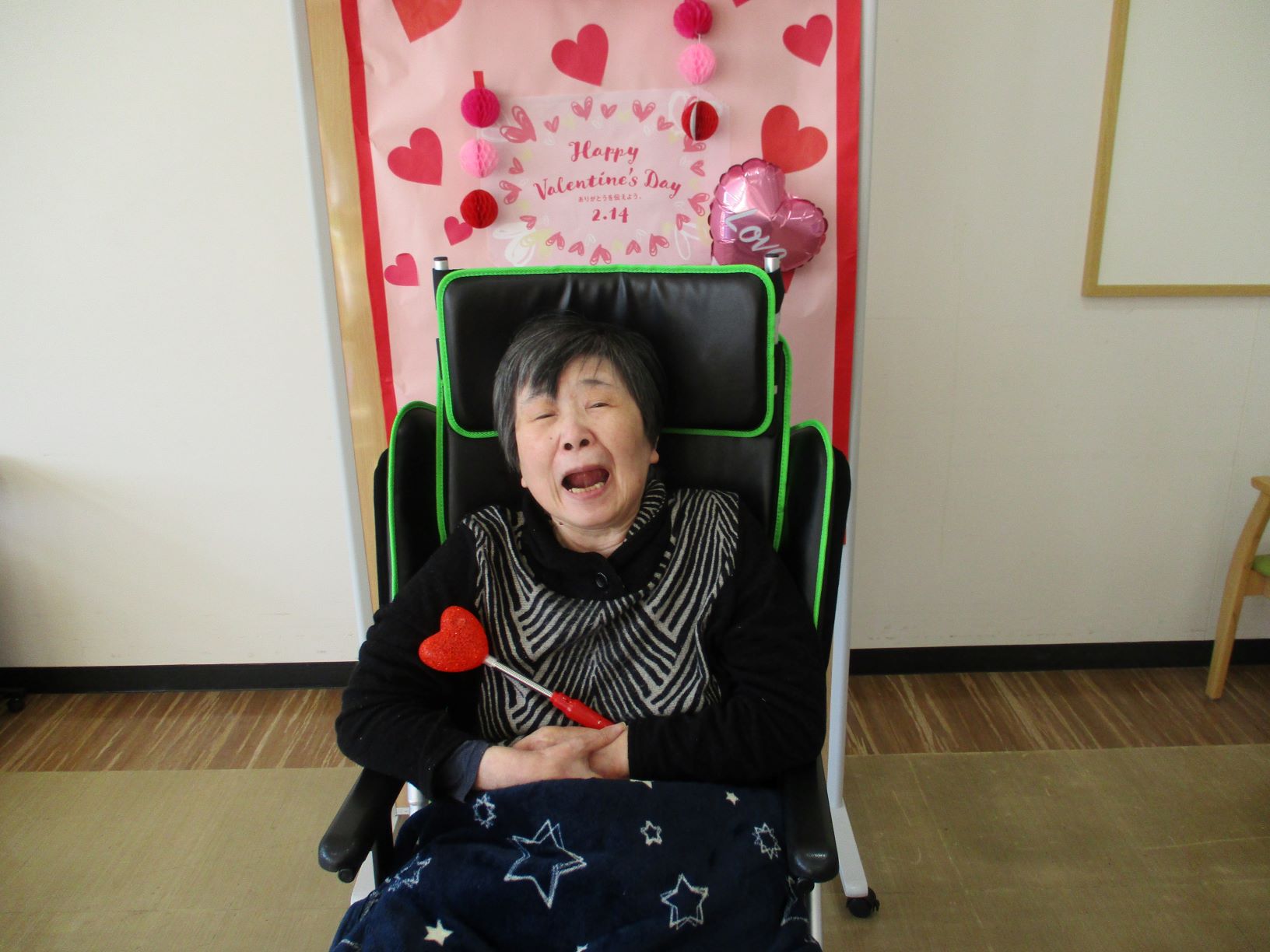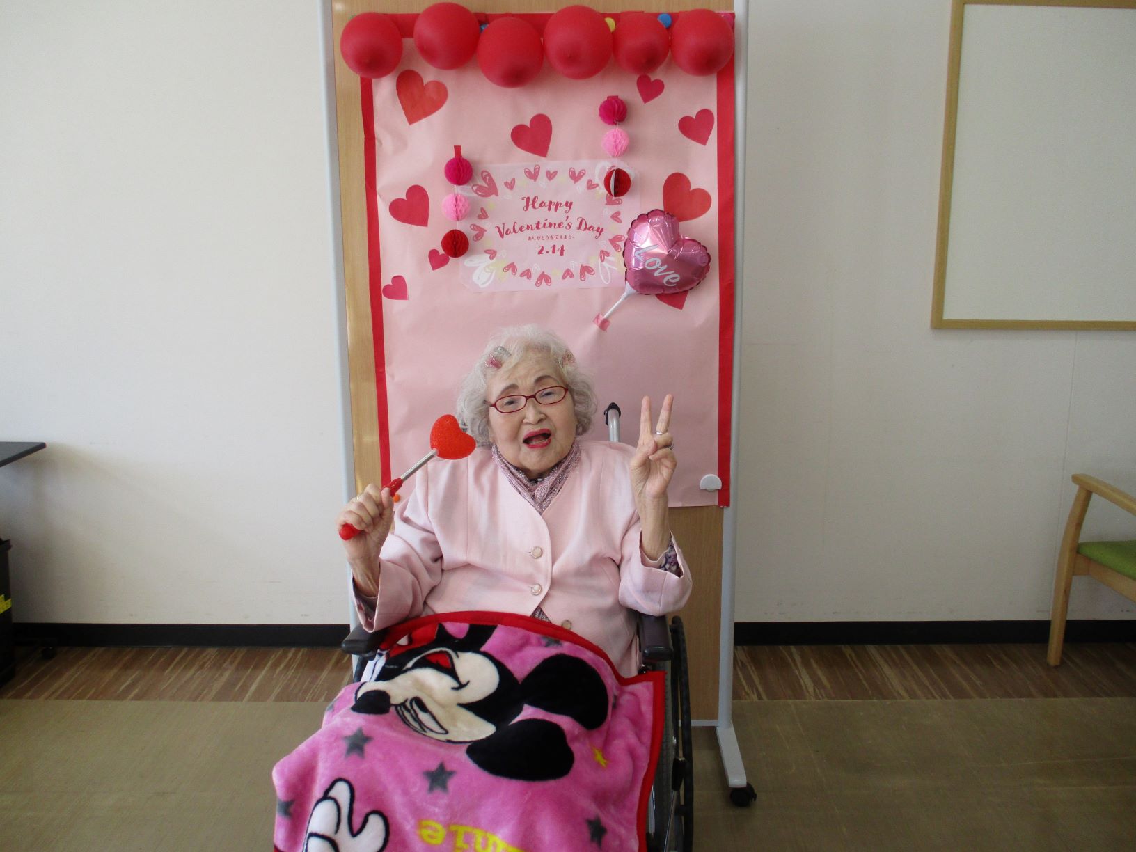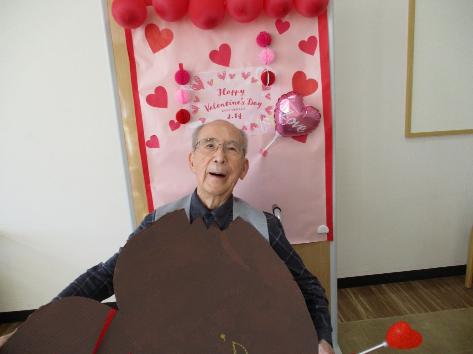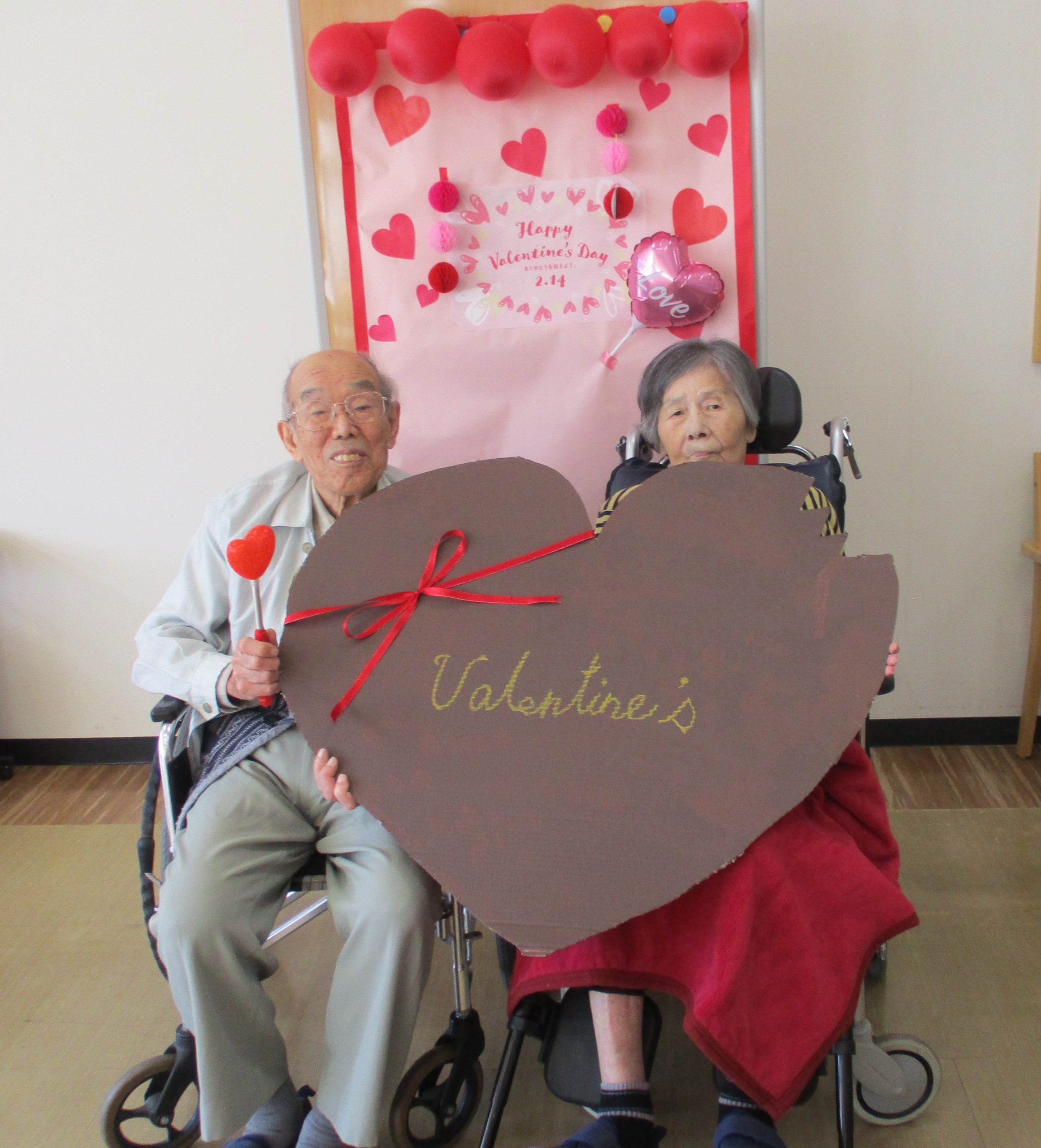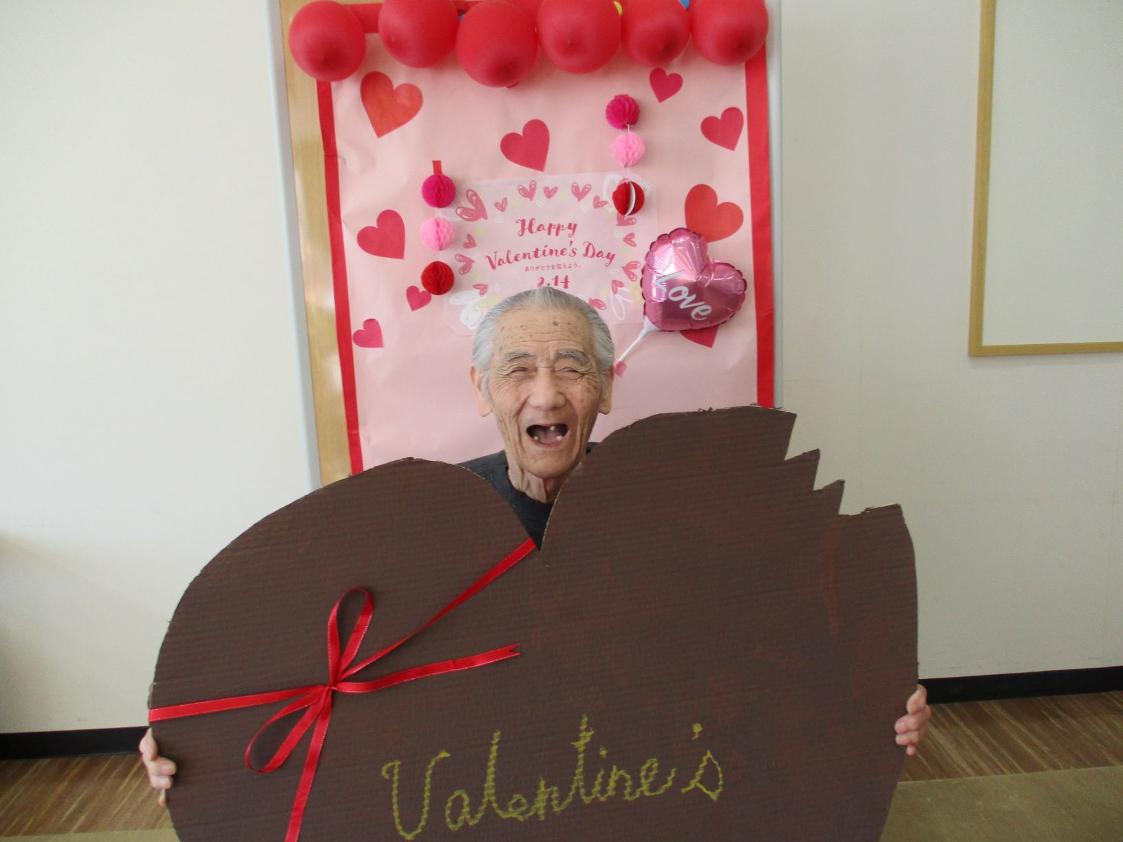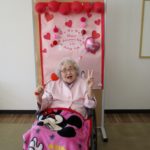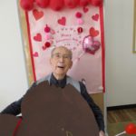 午後、バレンタインの飾り付けを背景にお一人づつ記念撮影をしました。