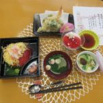 海鮮ちらし寿司、はまぐりのお吸い物、ワカサギと菜の花の天ぷら盛り、