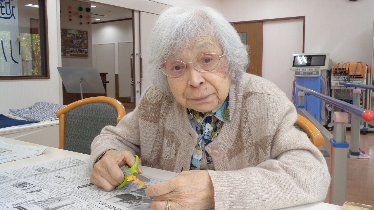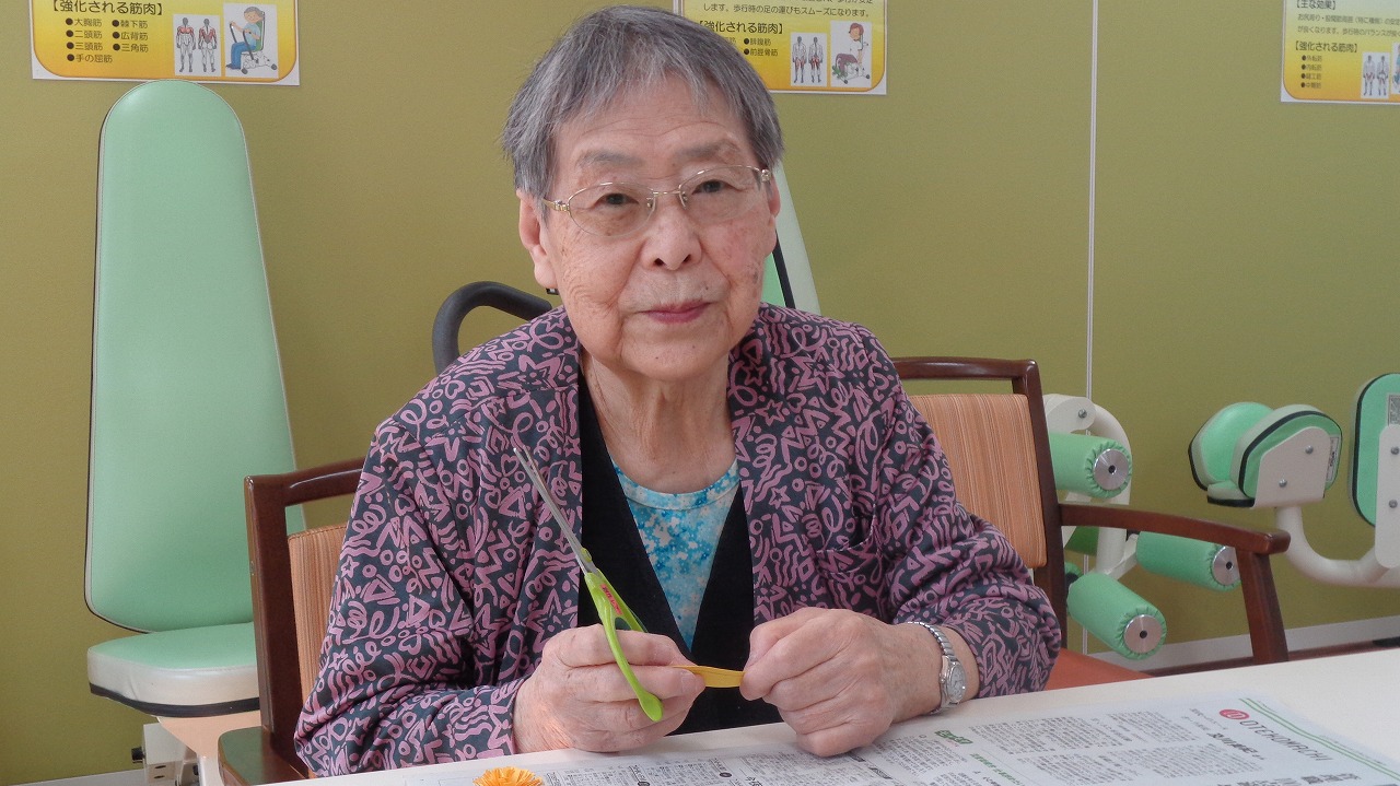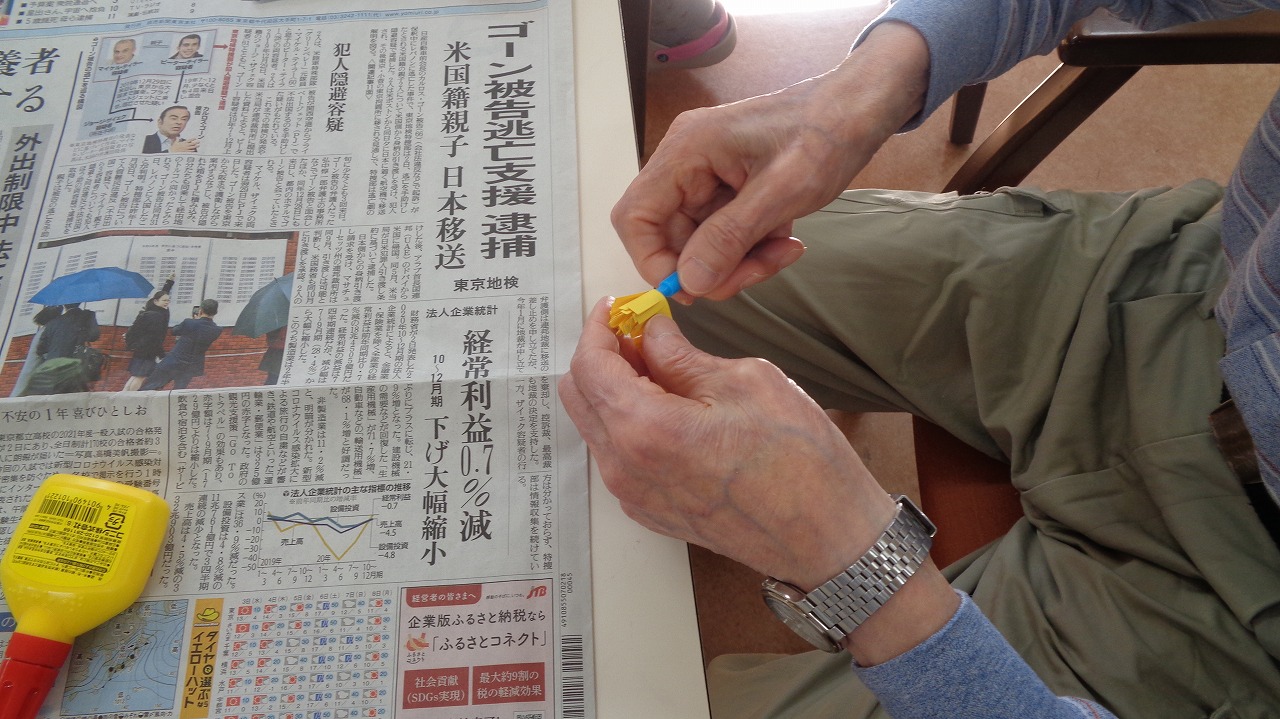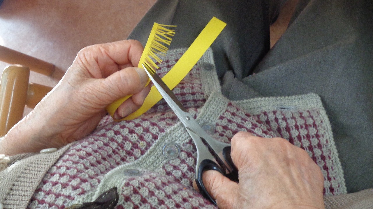 色紙を細かく縦に切り込みを入れ、切れないように繋げて切っていただき、くるくる巻いて完成です。
