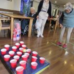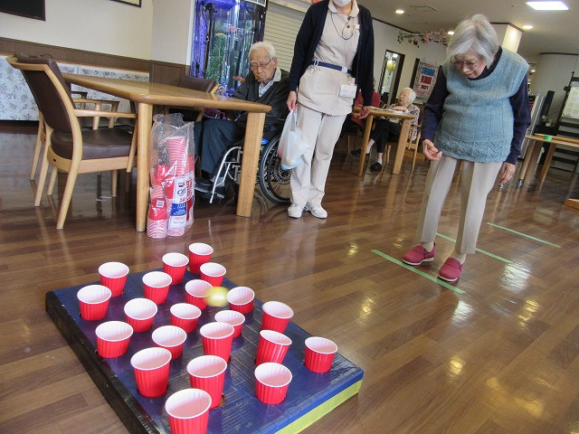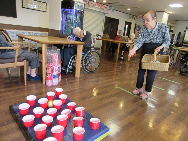 ボールを一定の距離から、カップに入れて得点を競うゲームです。