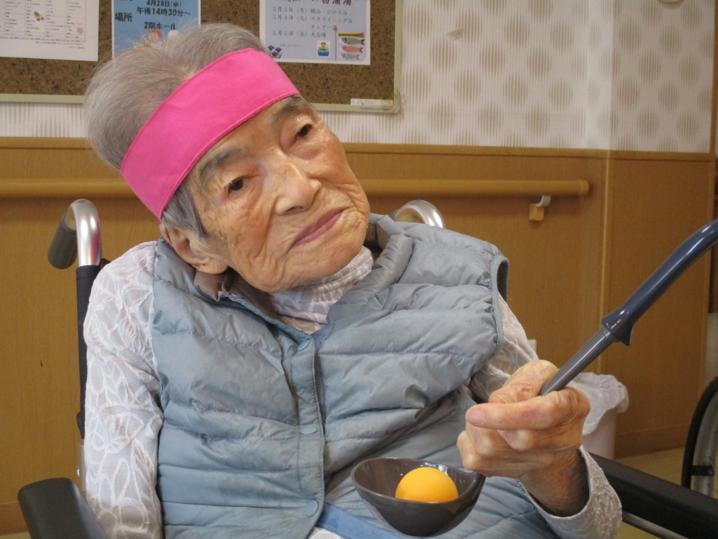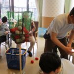 おたまで、ピンポン玉を隣の人に渡します。優しくピンポン玉を入れないと、落ちてしまいます。