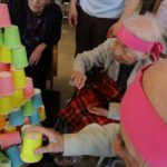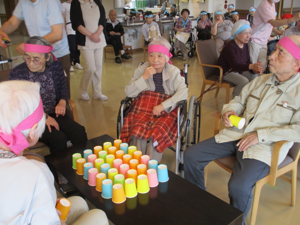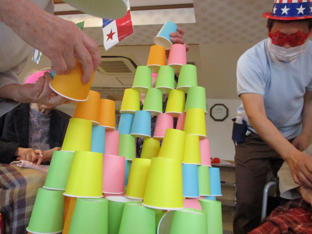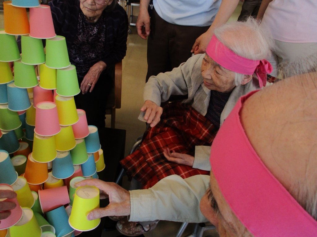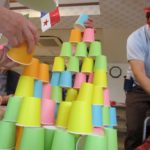 二種目目、紙コップでピラミット作りです。皆さん上手に積み上げていきます。