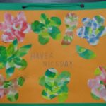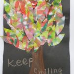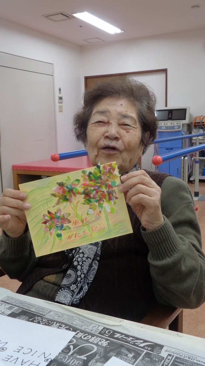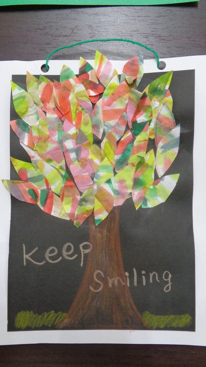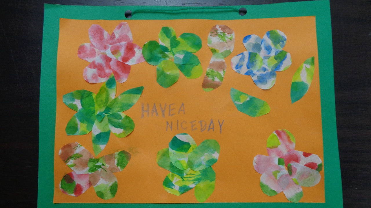 皆様それぞれイメージを膨らましているご様子で、お花や木・カモメ等、とても可愛い貼り絵を作って下さいました!そして英語のワンフレーズを加えて完成です♪