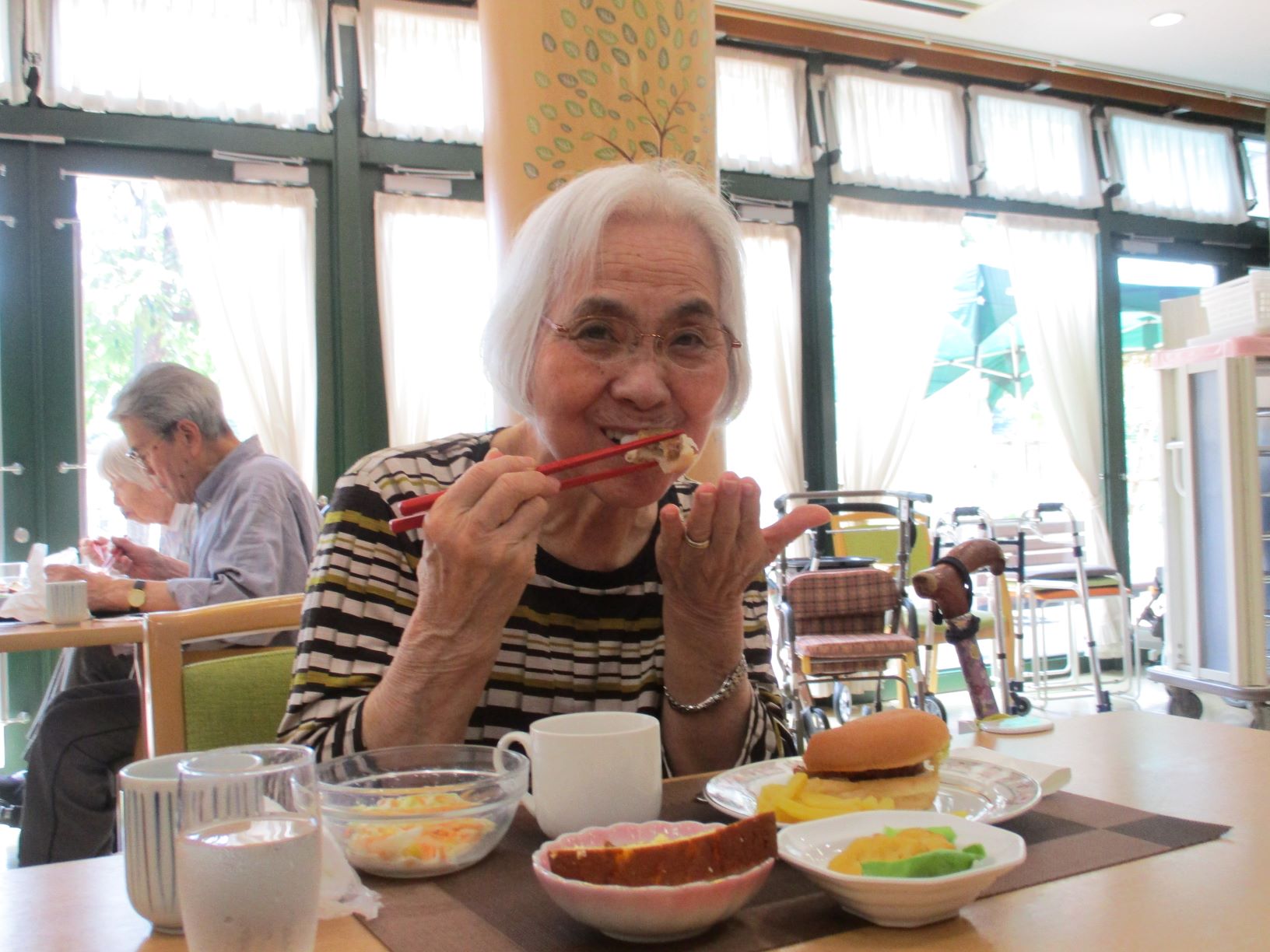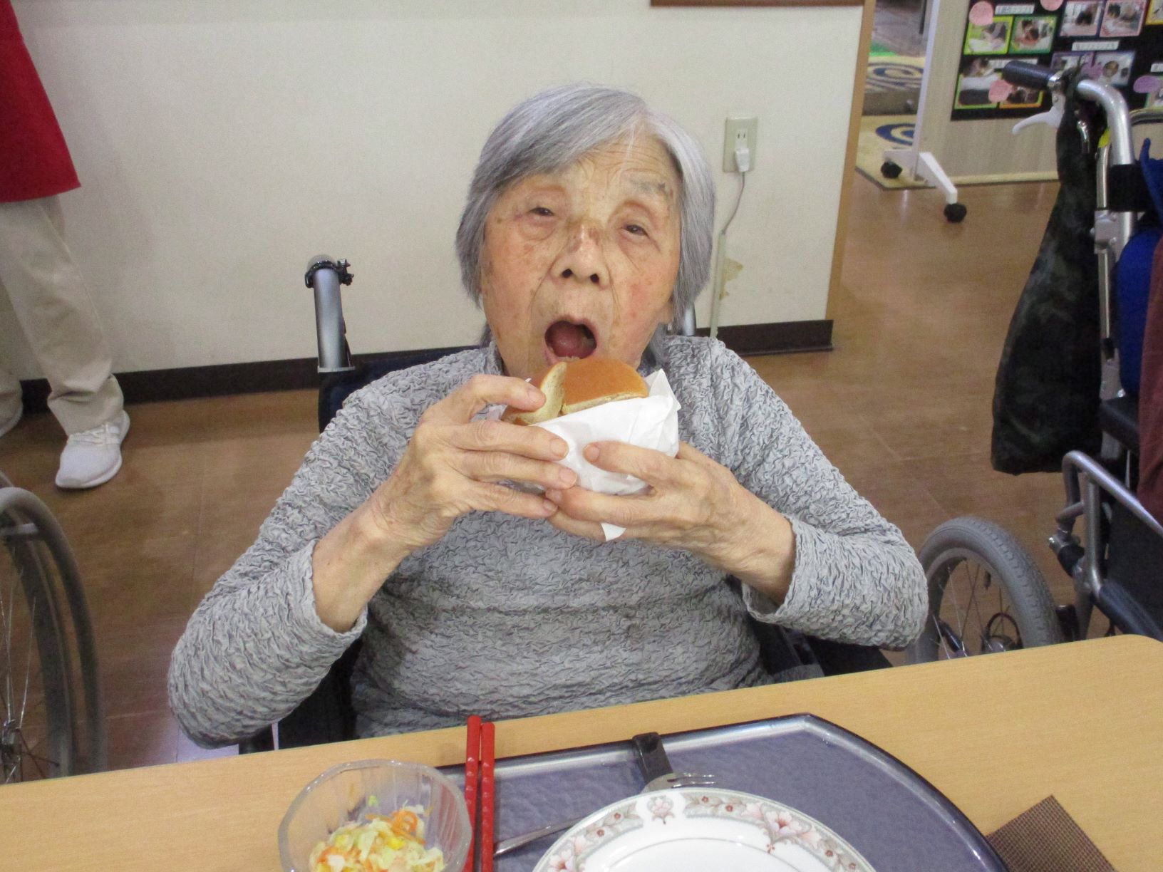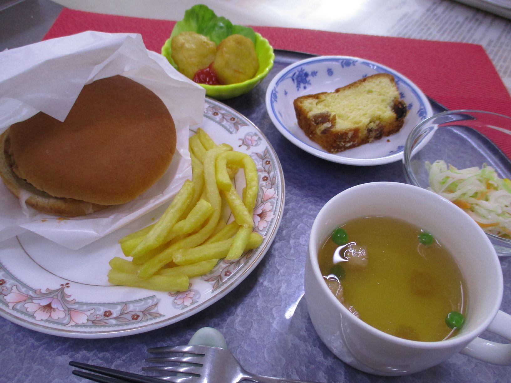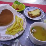 お昼ご飯には厨房さんの、手作りハンバーガーを提供して頂き