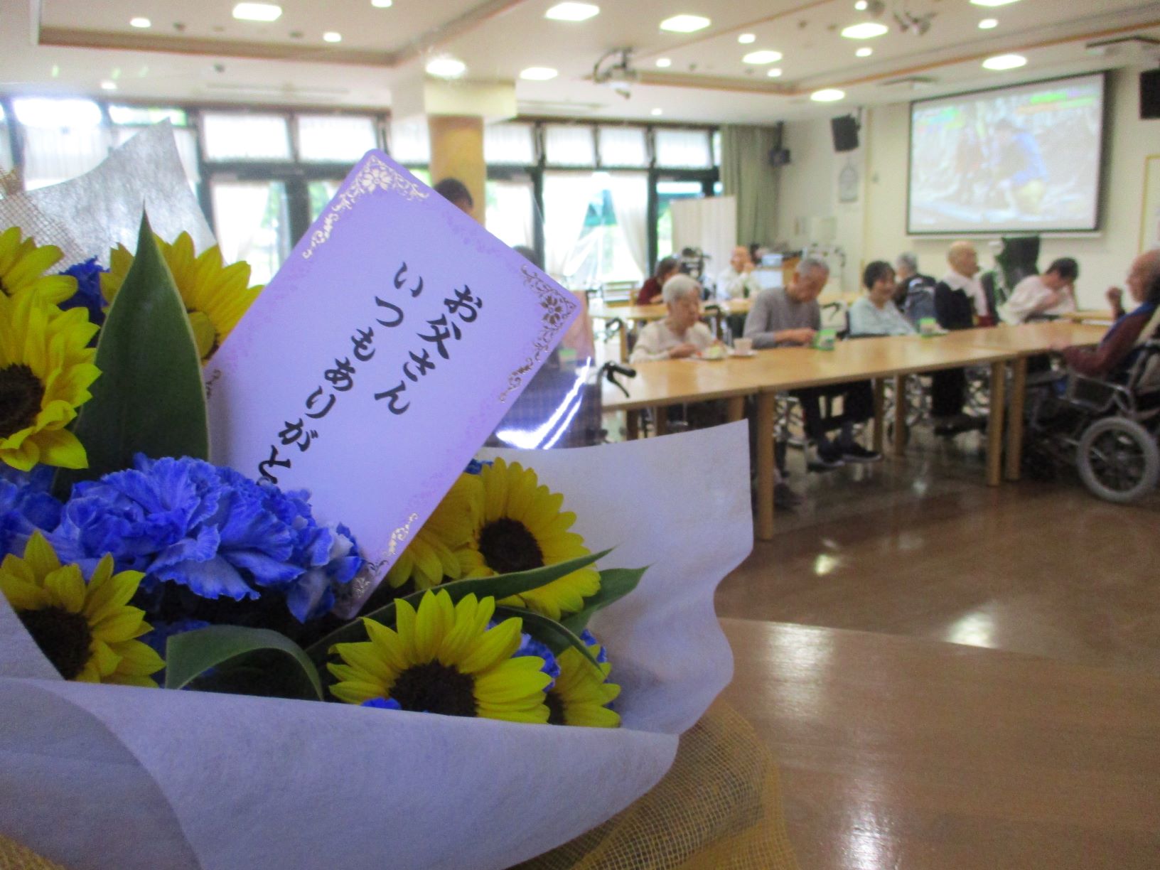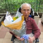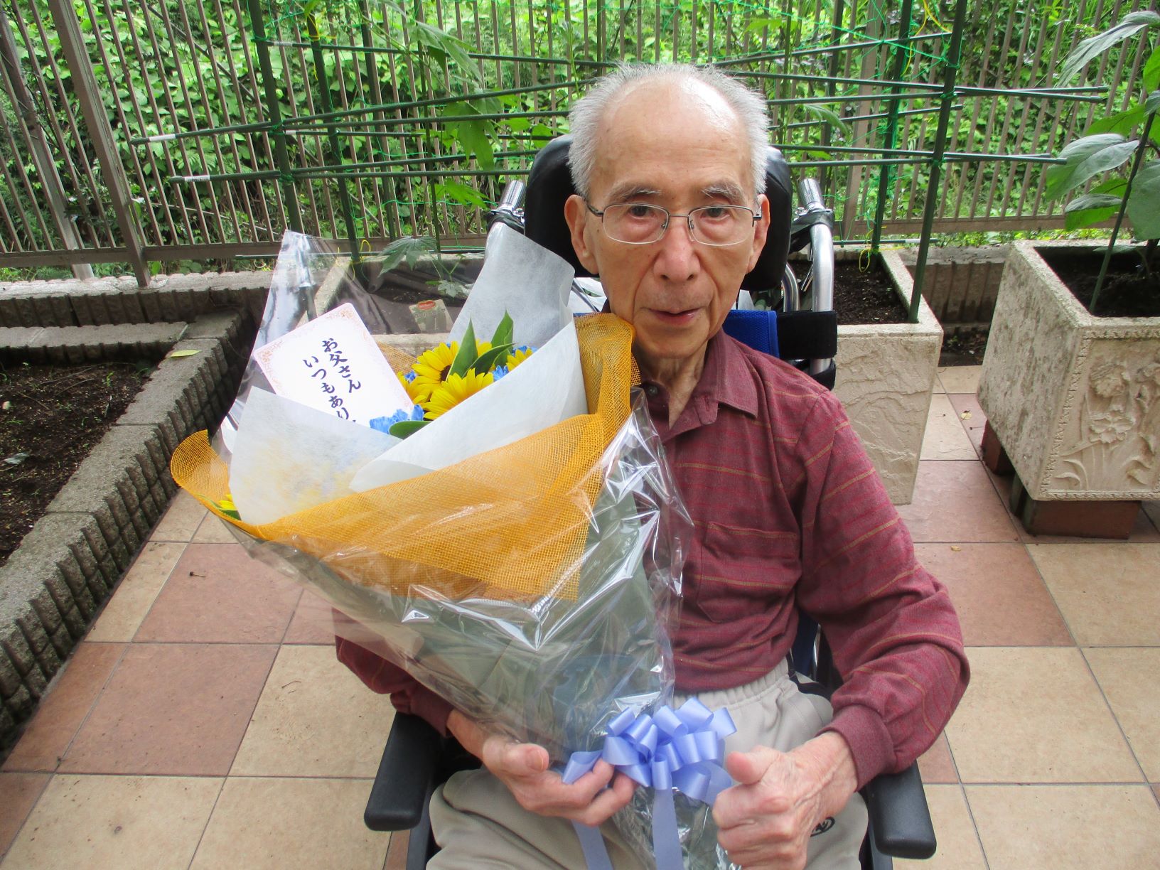 大きくてきれいな花束と共に、男性のご入居者はテラスのベンチにて