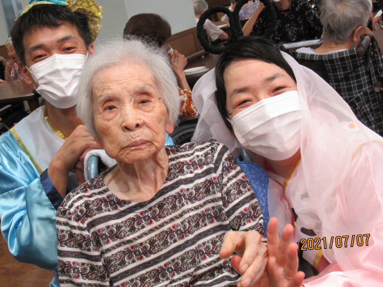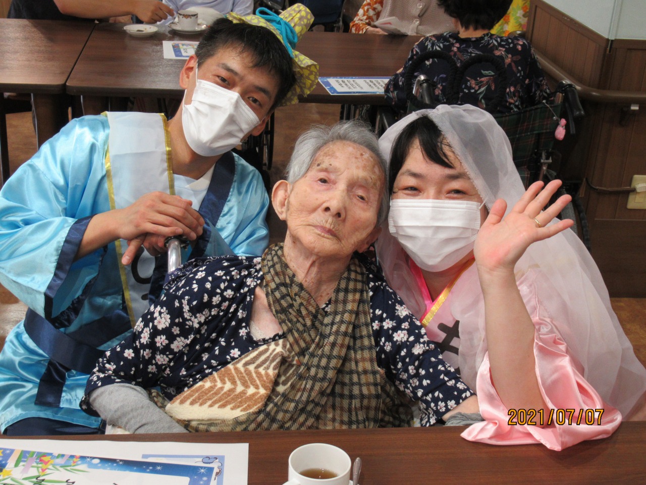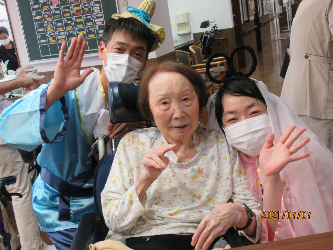勝った2人は衣装替え♪皆様が書かれた短冊を読み上げ、一緒に七夕の詩を歌いました。
