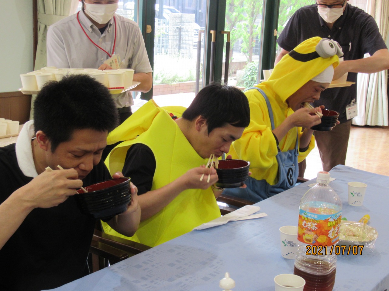 勢いよく食べる職員たち。2回戦行い、どちらも圧勝だったヘルパー長と新人男性ヘルパーが1位となりました!!
