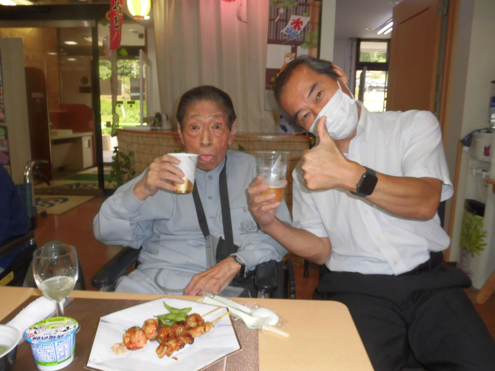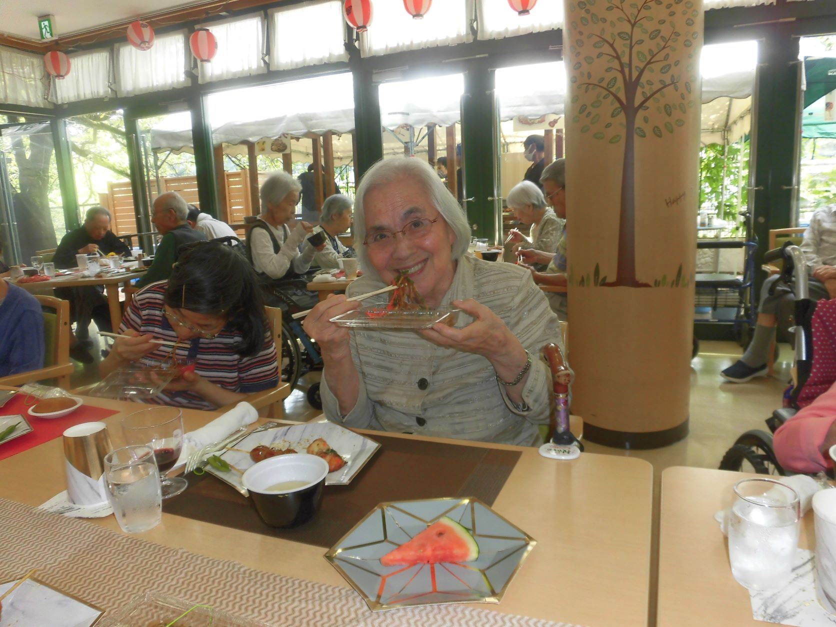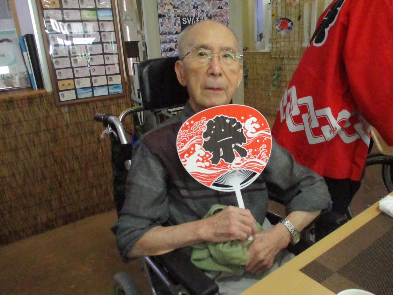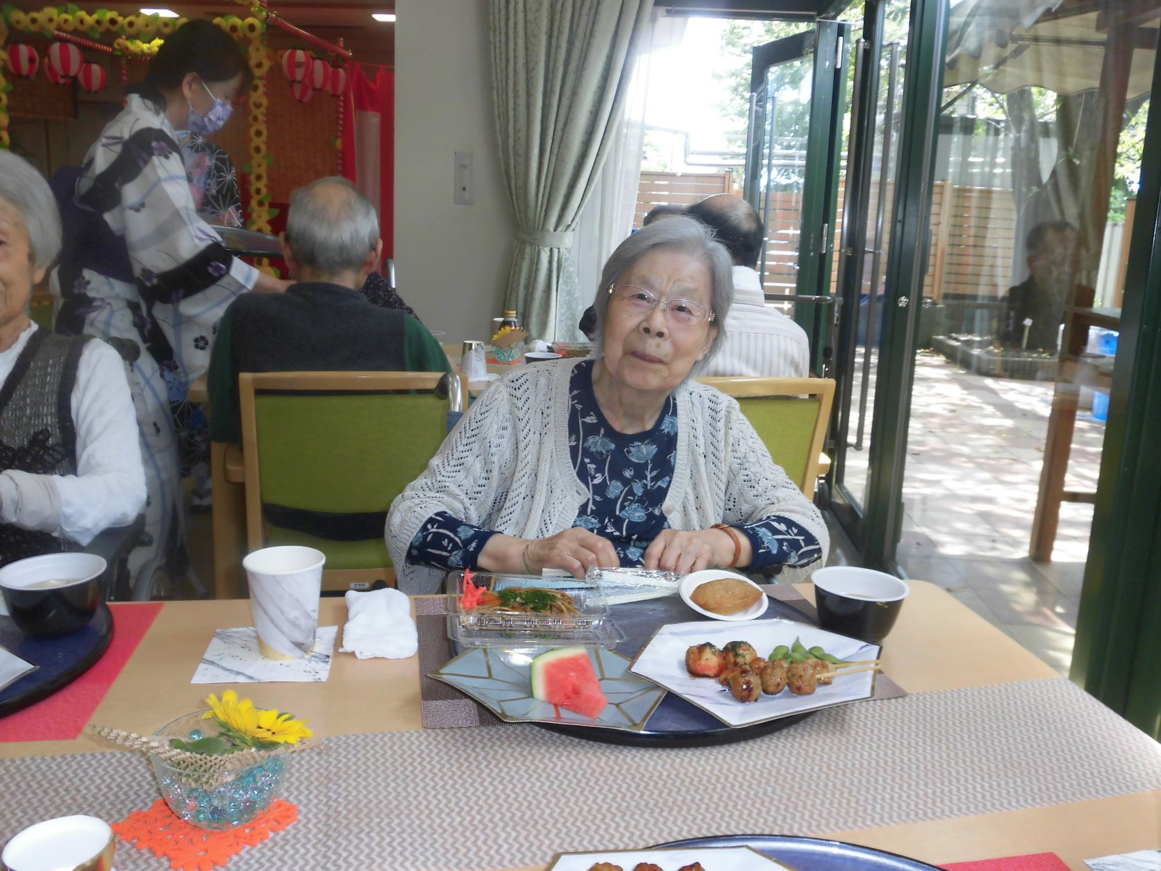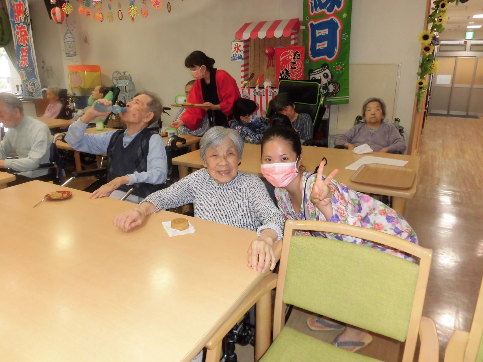 屋台の焼きそば、たこ焼き、焼き鳥、冷汁にご入居者の大満足の笑顔がこぼれます。