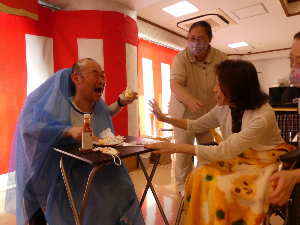 ご入居者から、「綺麗にお化粧出来ているよ」と、お声がかかるも、口紅は、大きく外れ大きな口になってしまいました。
