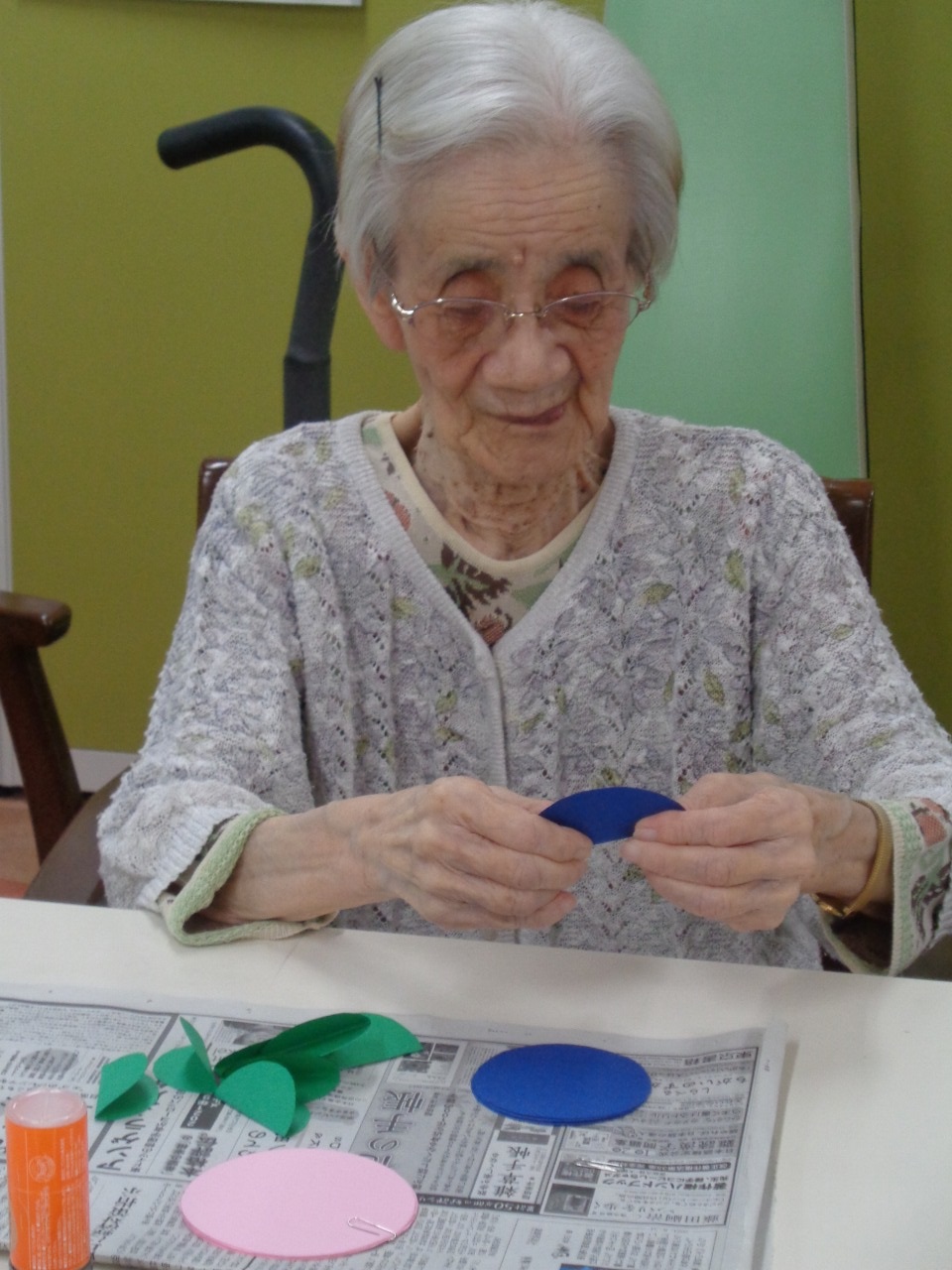 色画用紙を丸く切り、半分に折って糊付けしていきます。
