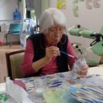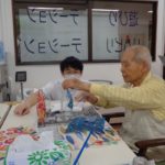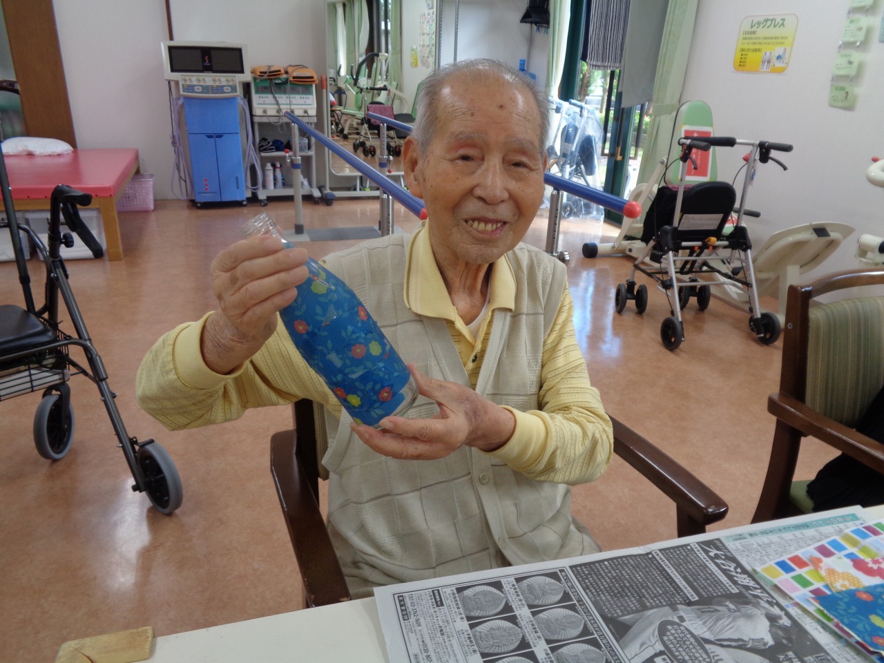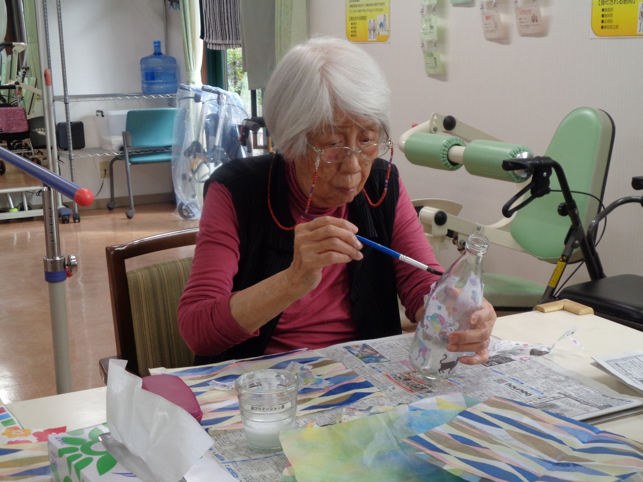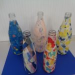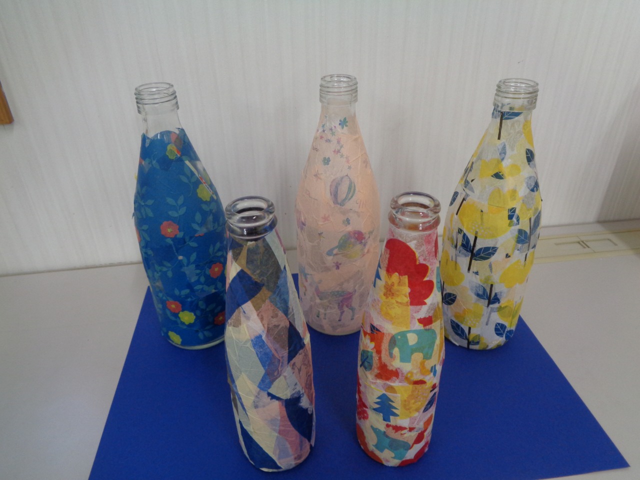 今回は薄い和紙をビリビリに破いていただき、透明の空き瓶に薄めたボンドで張り付けていきました。乾かして、その上からコーティング剤を塗って完成です!