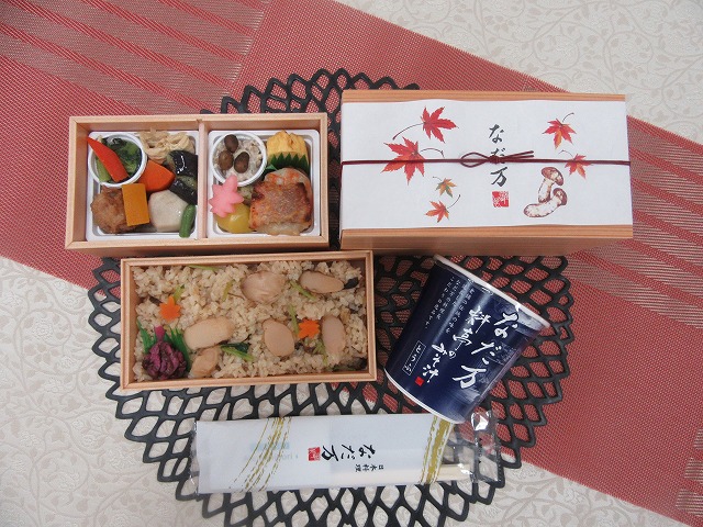 季節感ある彩豊かなお弁当。松茸御飯でお部屋中にいい香りが!