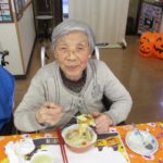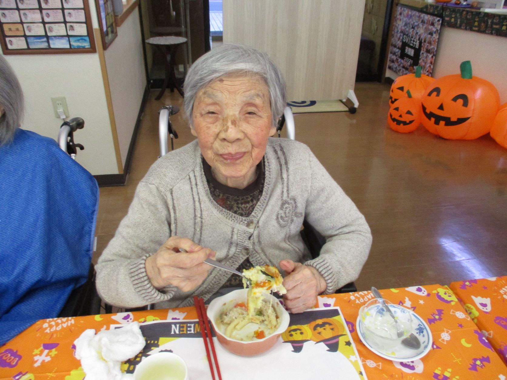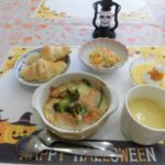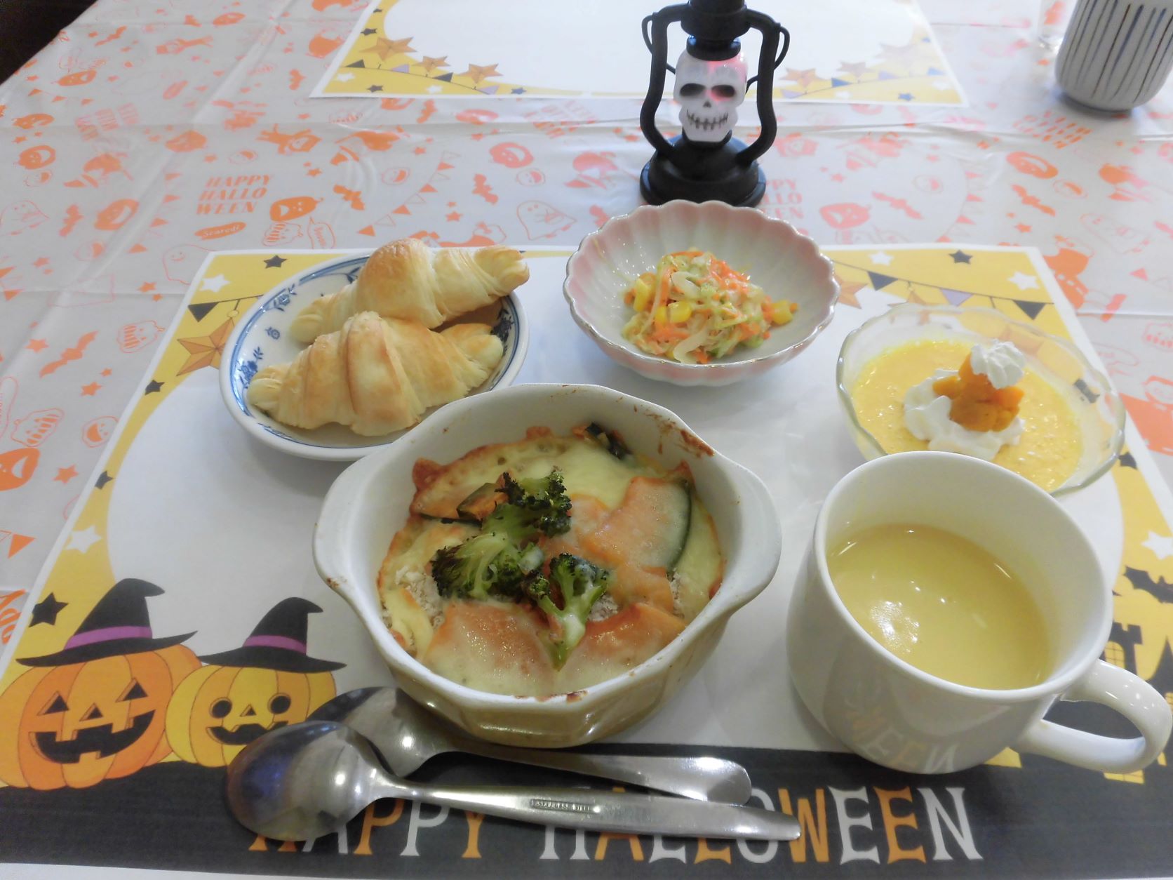 昼食には、カボチャ入りグラタンや、コーンスープ等ハロウィンにふさわしい