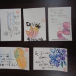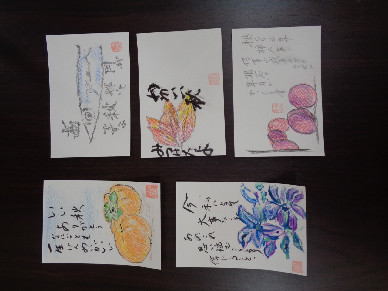 桔梗や柿、秋刀魚など秋の物を選ばれ、真剣にハガキに