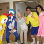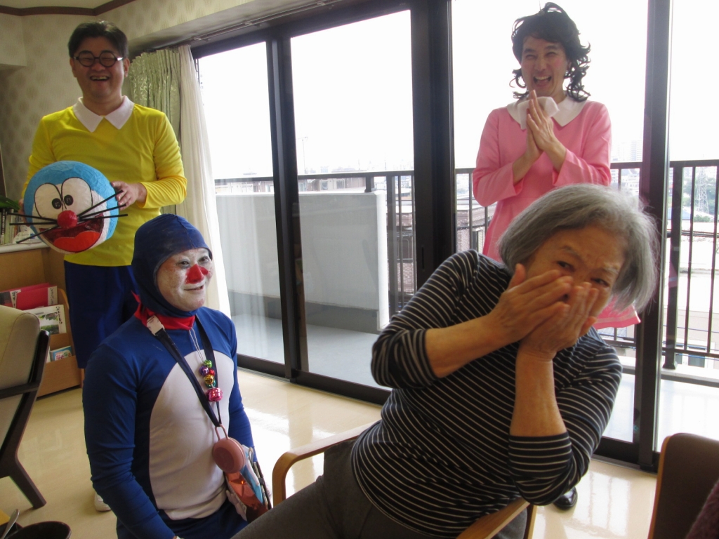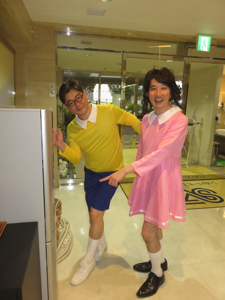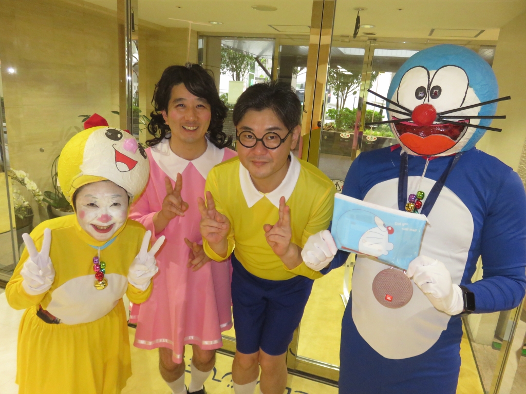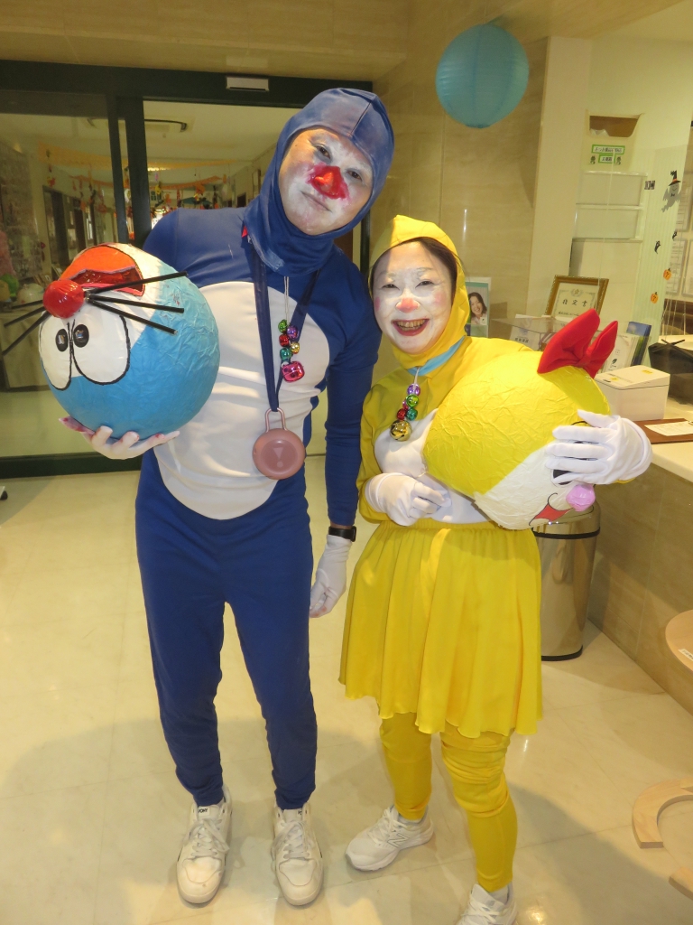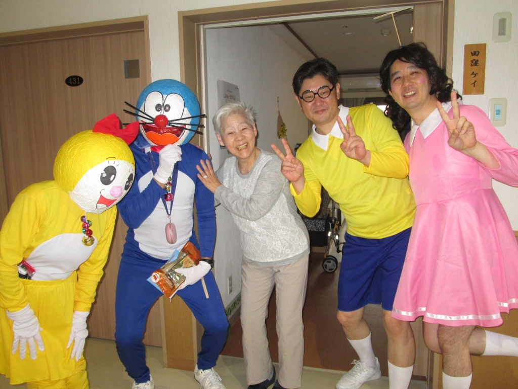 しずかちゃんは、諸星施設長、のび太君は井上副施設長が、ドラえもんは、奥本次長が、ドラミちゃんは渡邊が仮装し回らせて頂きました。