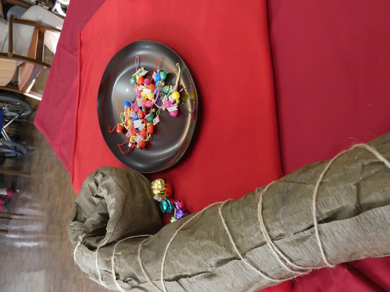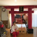 手作りの鳥居をくぐり、ガラガラ(鈴)、チャリ〜ン(お賽銭)、二礼ニ拍手一礼。