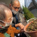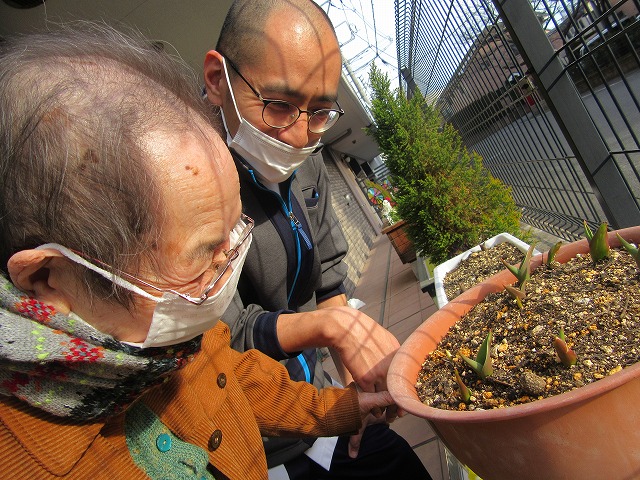年末に植えたチューリップの球根から出たかわいい芽を話題にし、