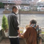 ぽかぽかの1階テラスで、遊びりテーション課の職員とご入居者が、
