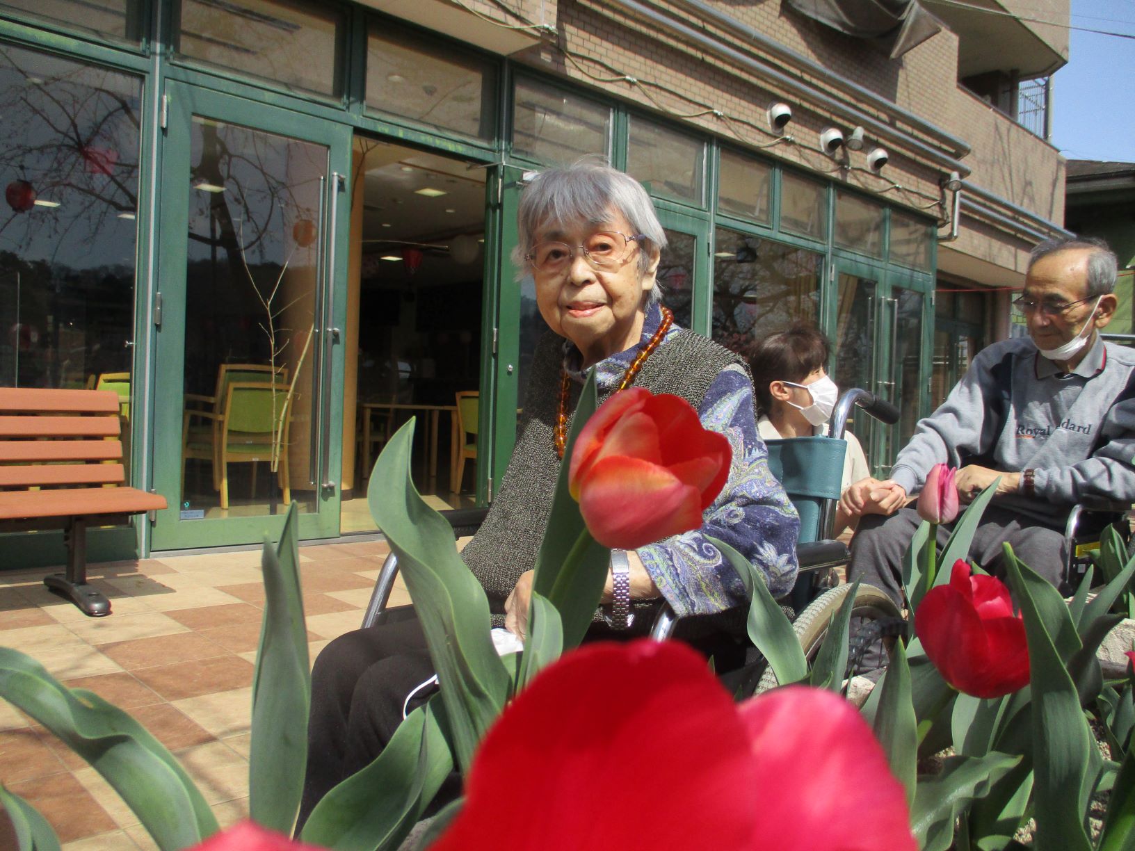 晴天の空に見舞われ陽気も良く午後に、ご入居者と一緒にテラスにでました。