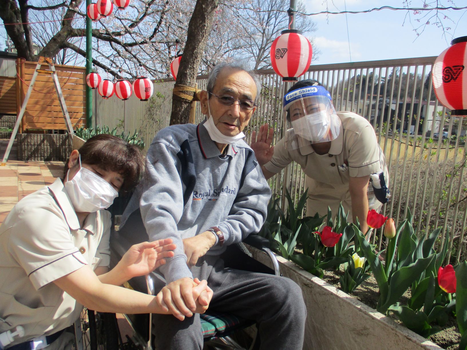 テラスに出ては、「暖かくなってきたわねー」「外に出れて気持ちが良いよ」と笑顔でおっしゃらていました。 春の陽気が訪れており、八王子西の桜の木も満開に咲き始めようとしています。