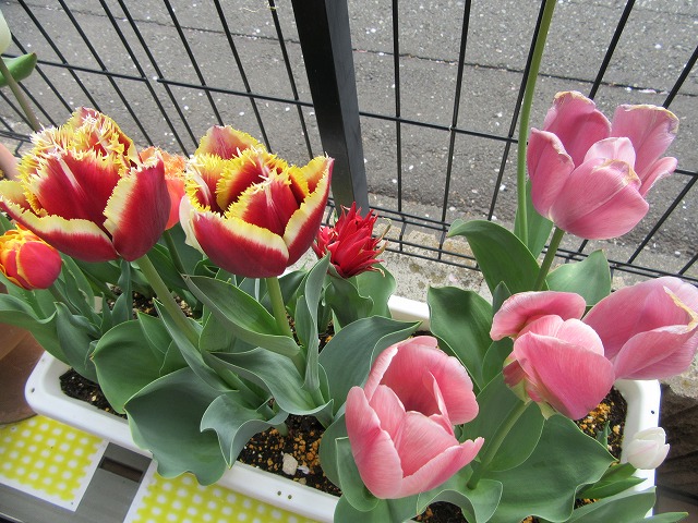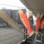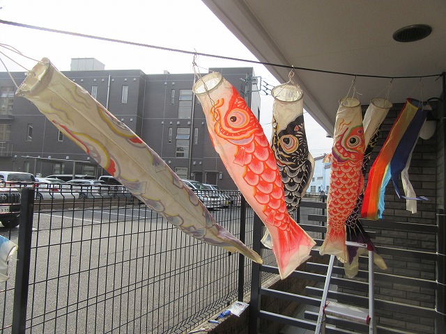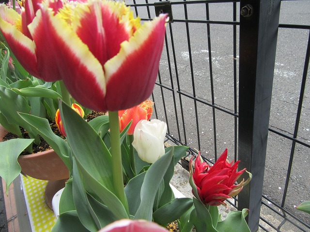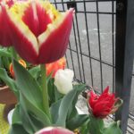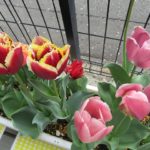 おしゃれなチューリップの隣には一足早く鯉のぼりが!