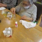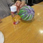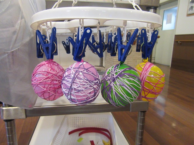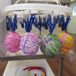 今日は、水風船にボンド水につけた刺繍糸を巻き付け