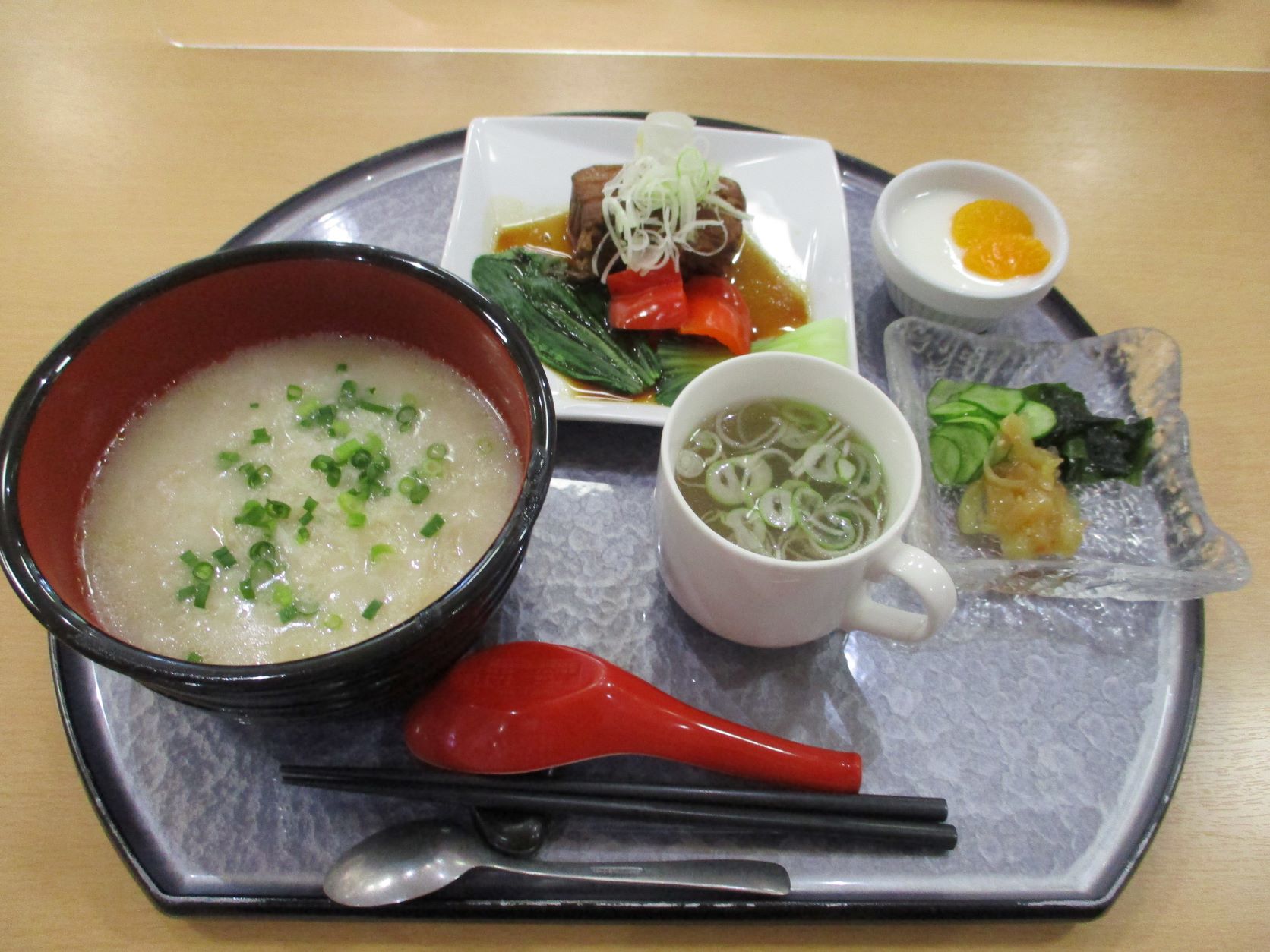 メニューは、中華粥、トンポーロー(豚の角煮)、コリコリ中華クラゲの和え物、杏仁豆腐を提供致しました。