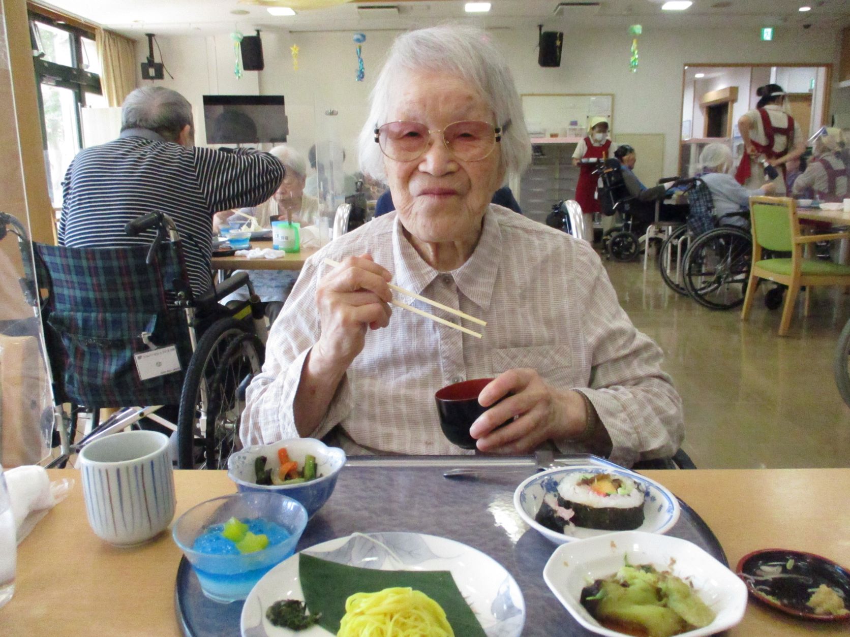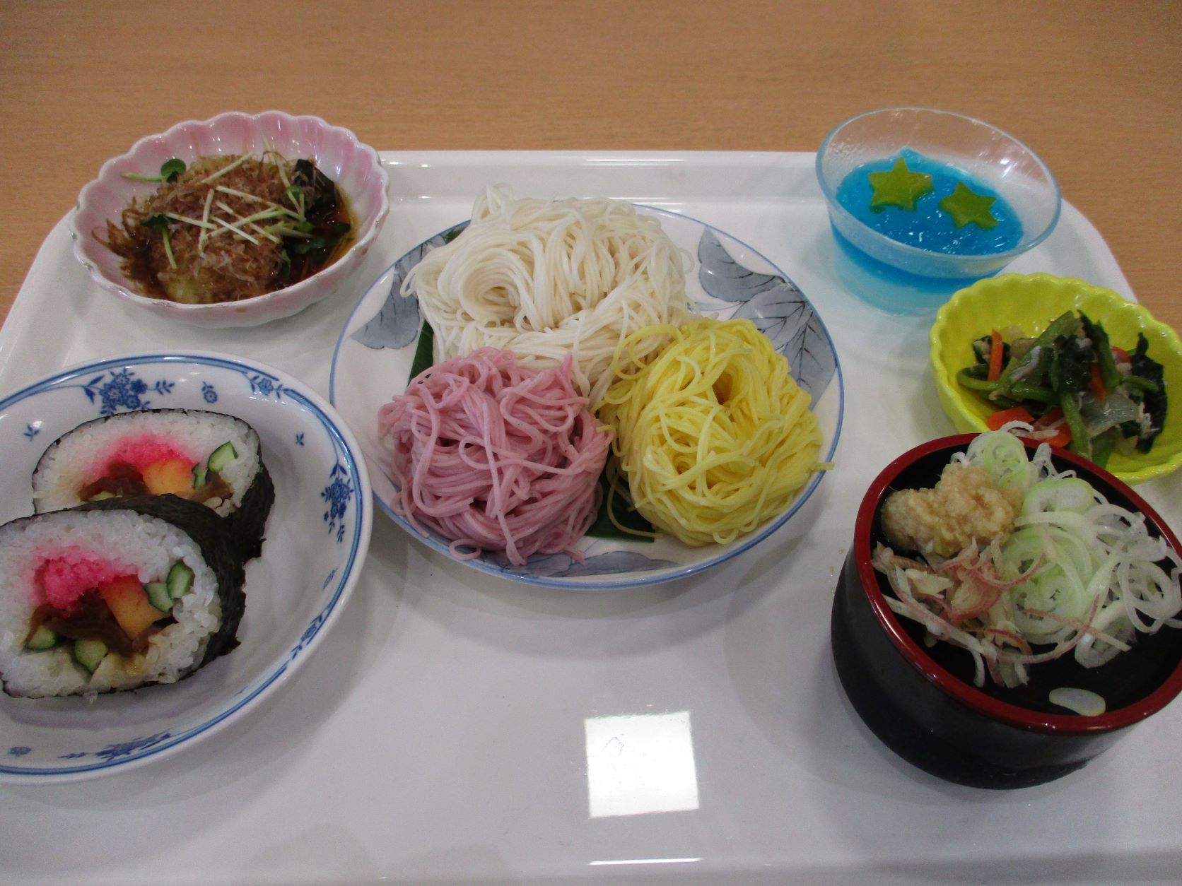 昼食には三色そうめんと、七夕ゼリー。おやつには職員の手作りモンブランを提供致しました♪